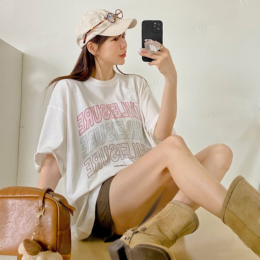 フロントに大きく配置されたカラーロゴがポイントの半袖Tシャツ×ショートパンツのセットアップ♡