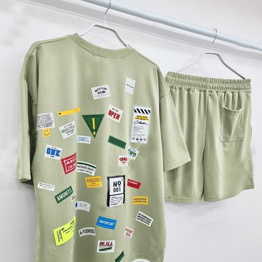 ランダムに配置されたバックラベルが目を引くTシャツ×ショートパンツのセットアップ♡