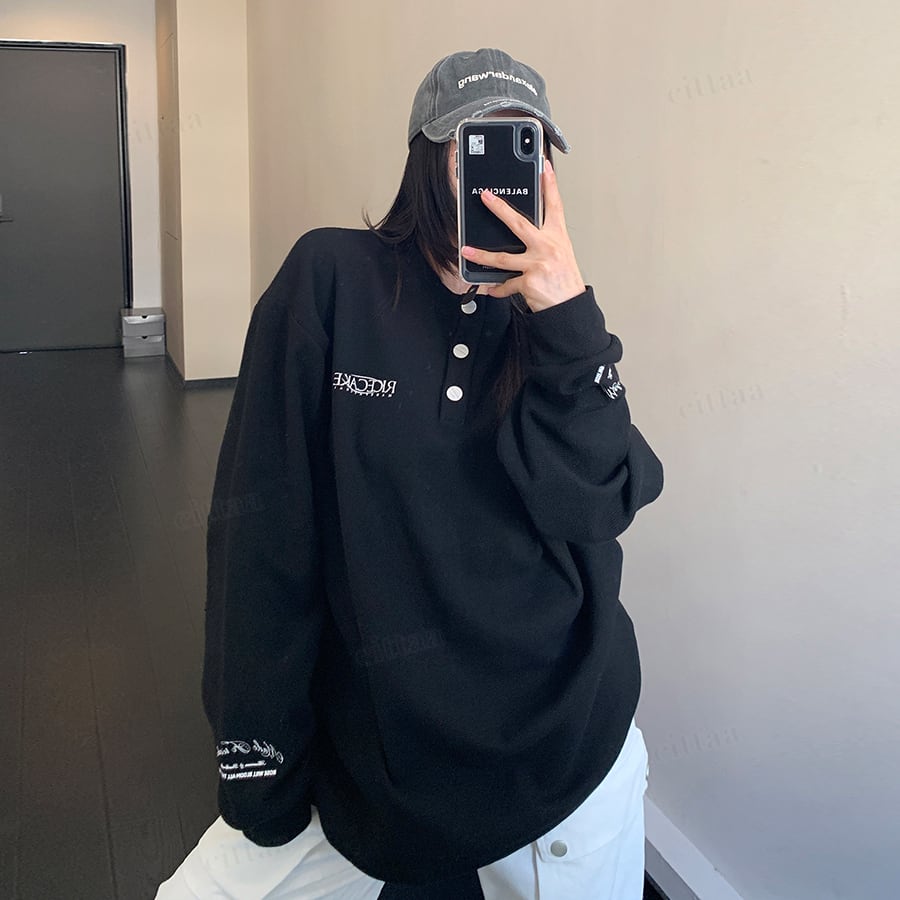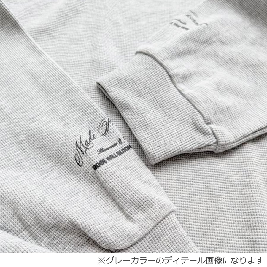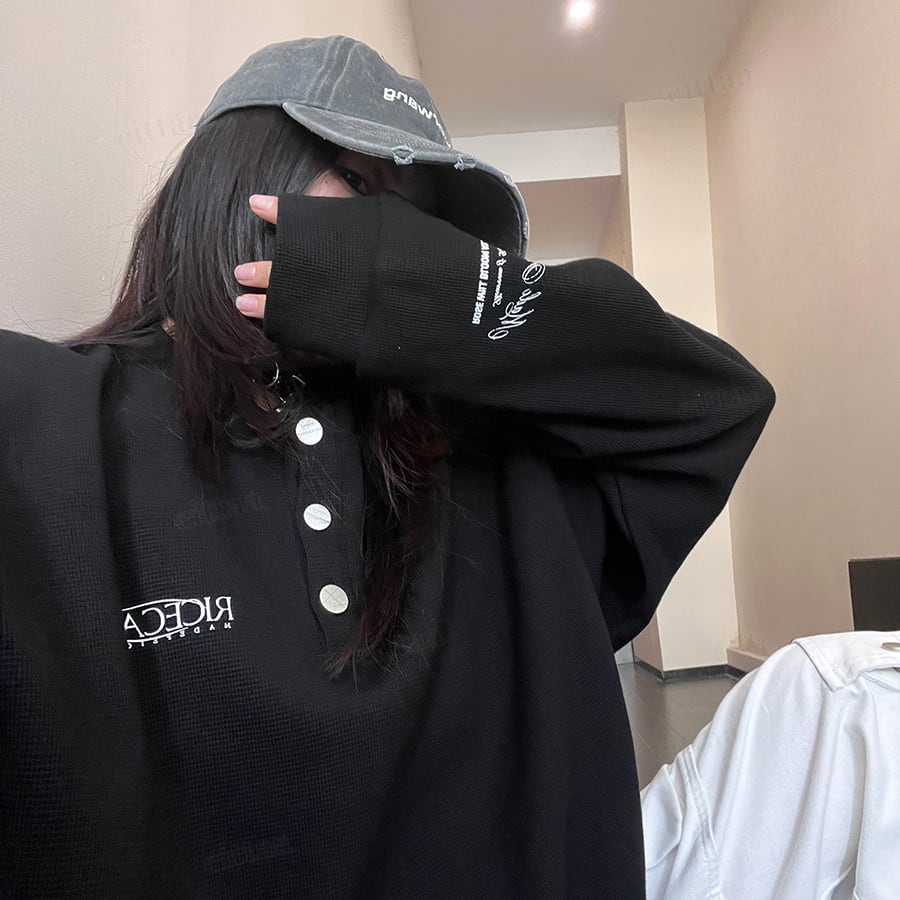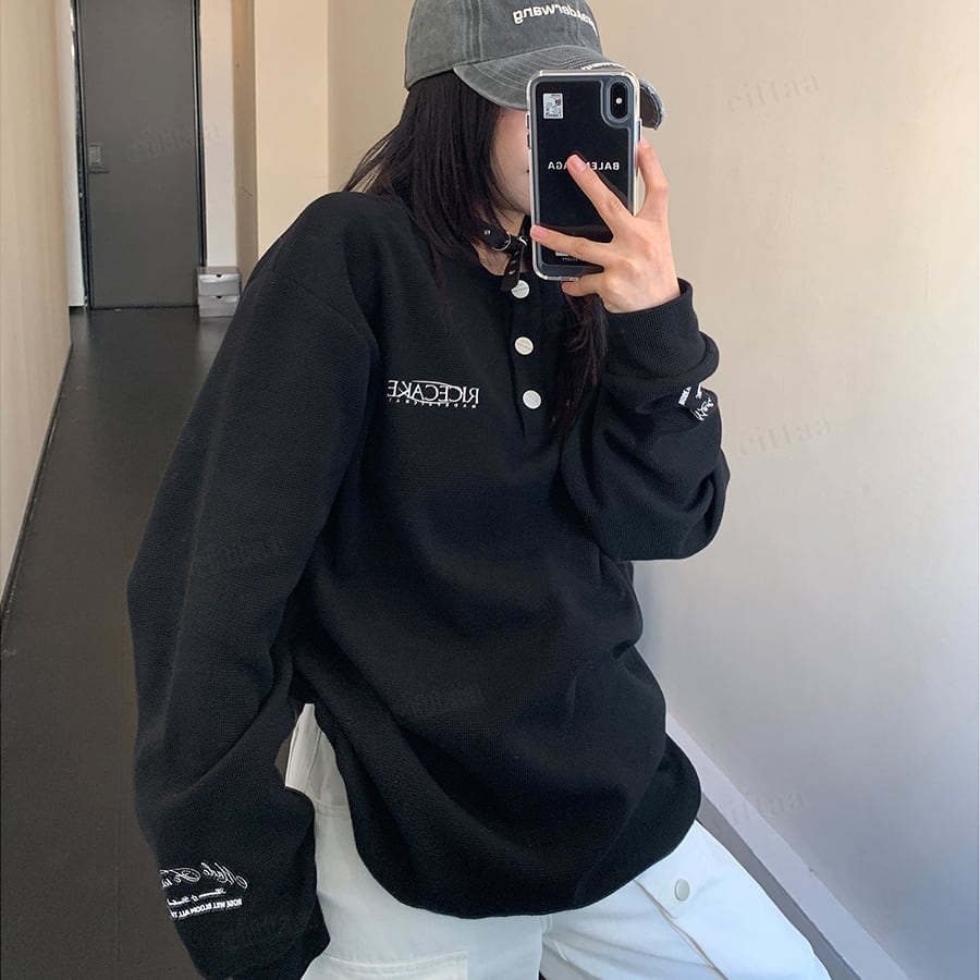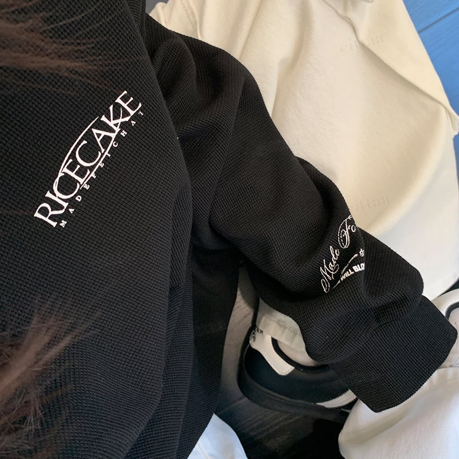 C-325 2025夏秋新作♡ヘンリーネック バックラベル付きRICECAKEロゴ長袖ワッフルTシャツ ブラック 0808