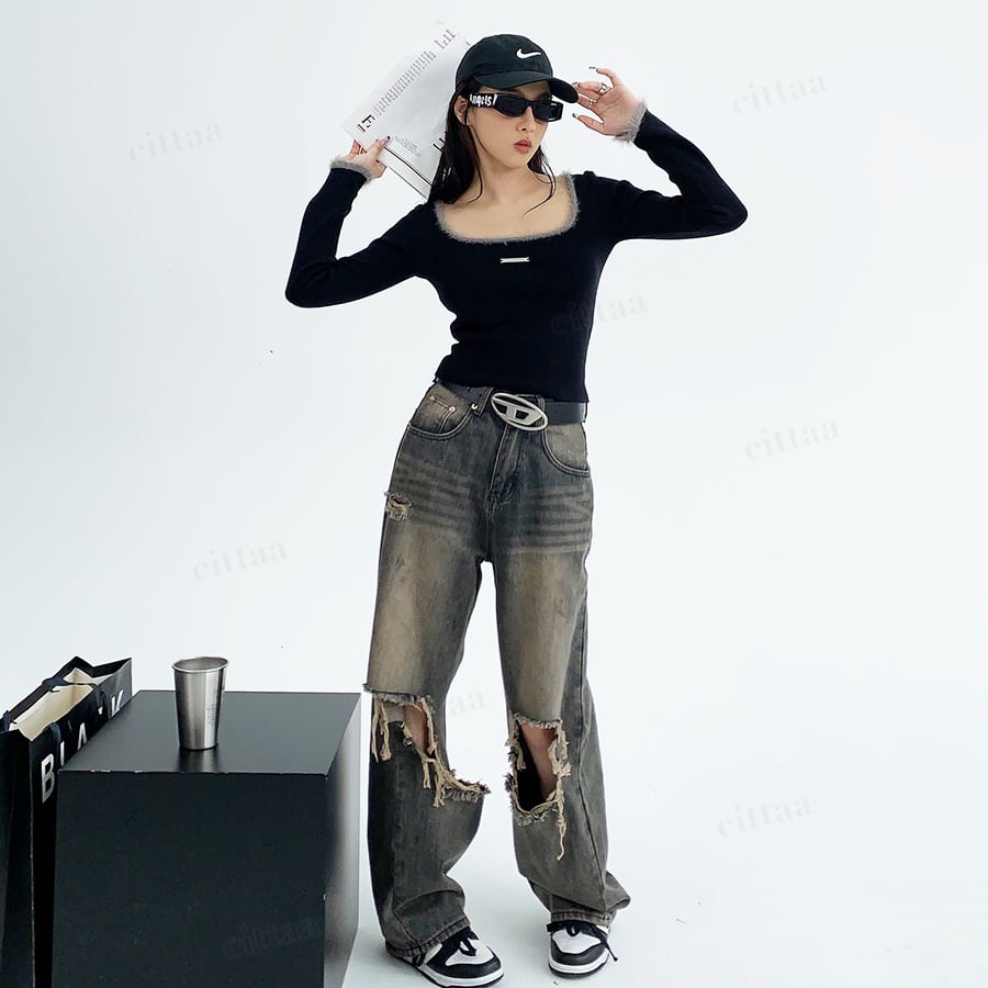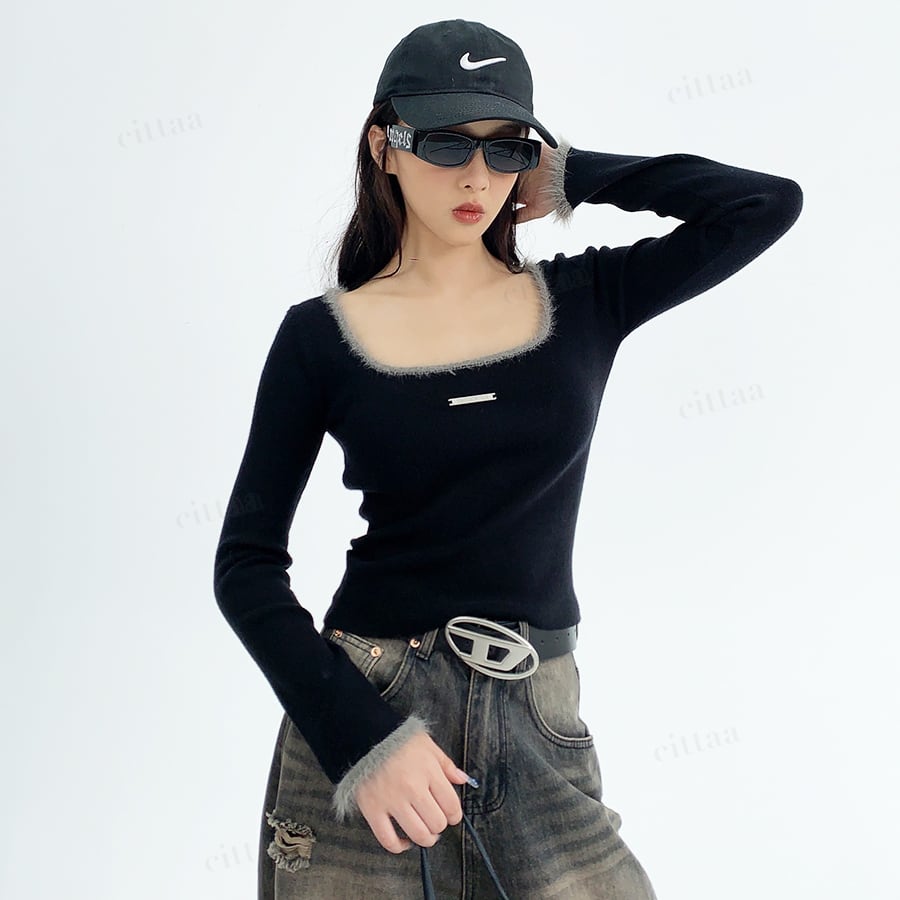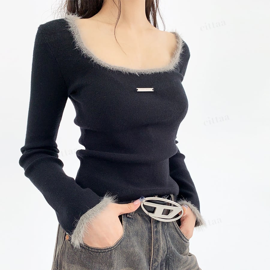 C-342 2025秋冬新作♡ファーデザインスクエアネックリブカットソー ブラック 0808