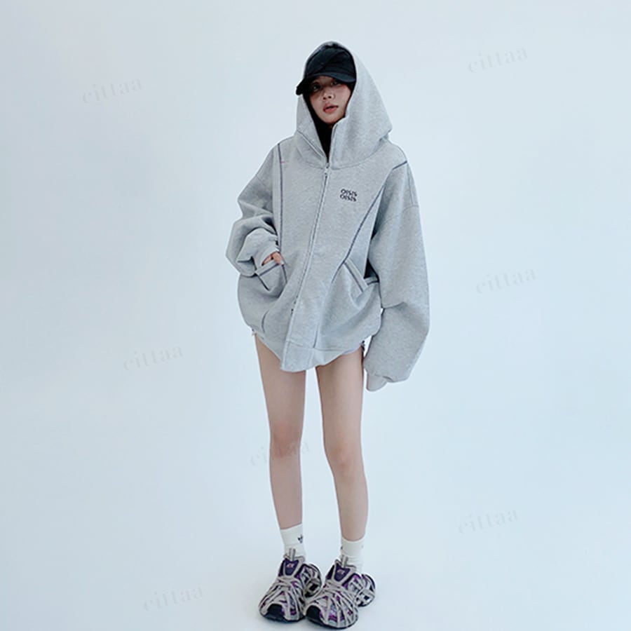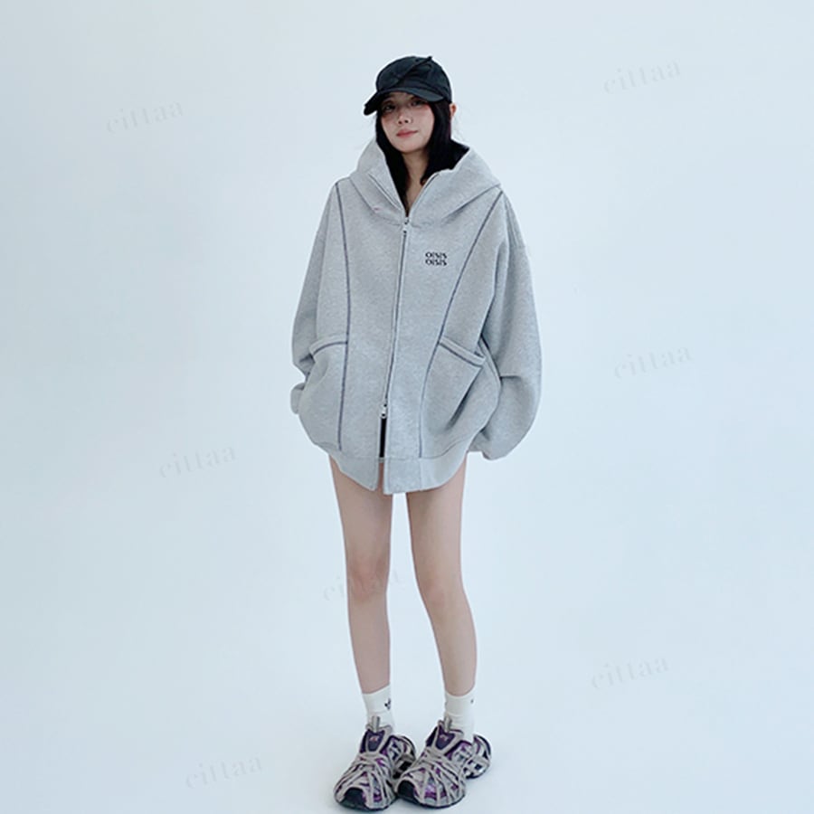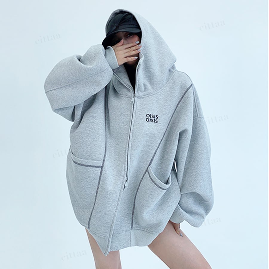 【即納】【早割限定特典10%OFF】D-385 2025秋新作♡OISIS配色パイピングダブルジップスウェットパーカー グレー