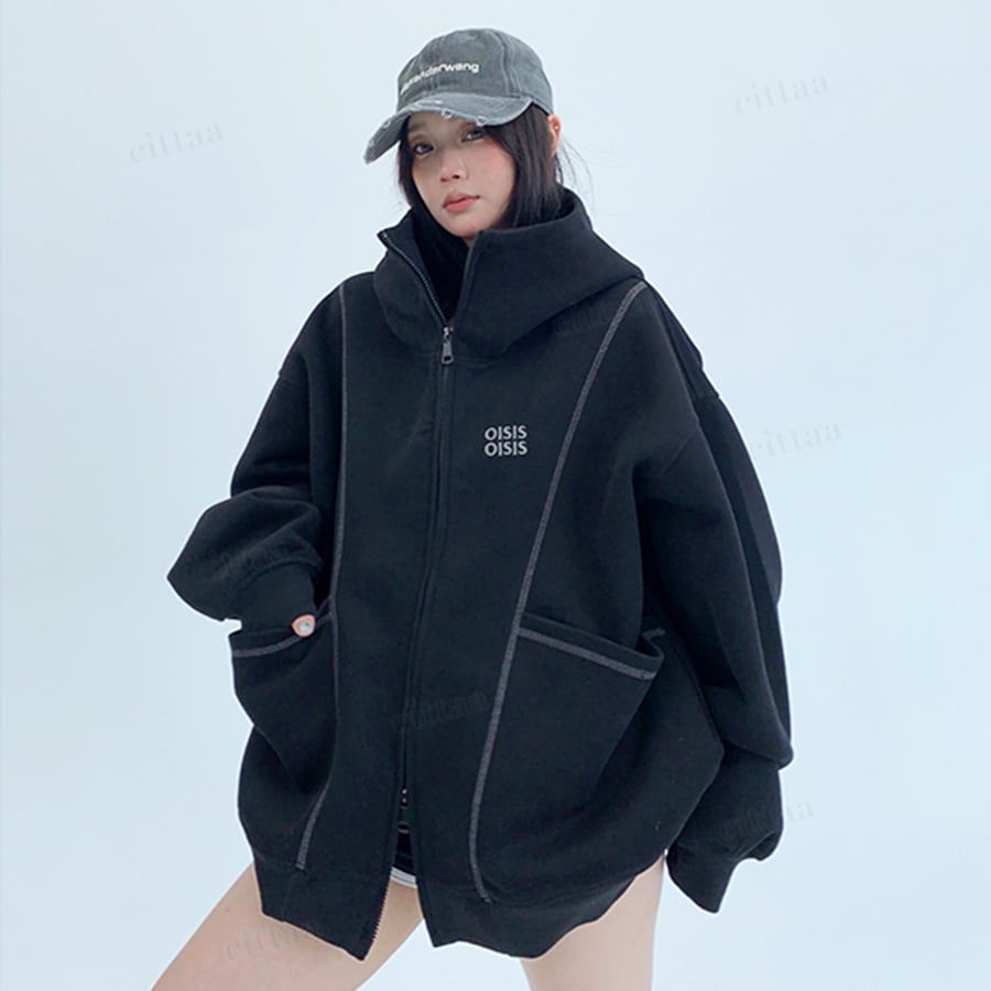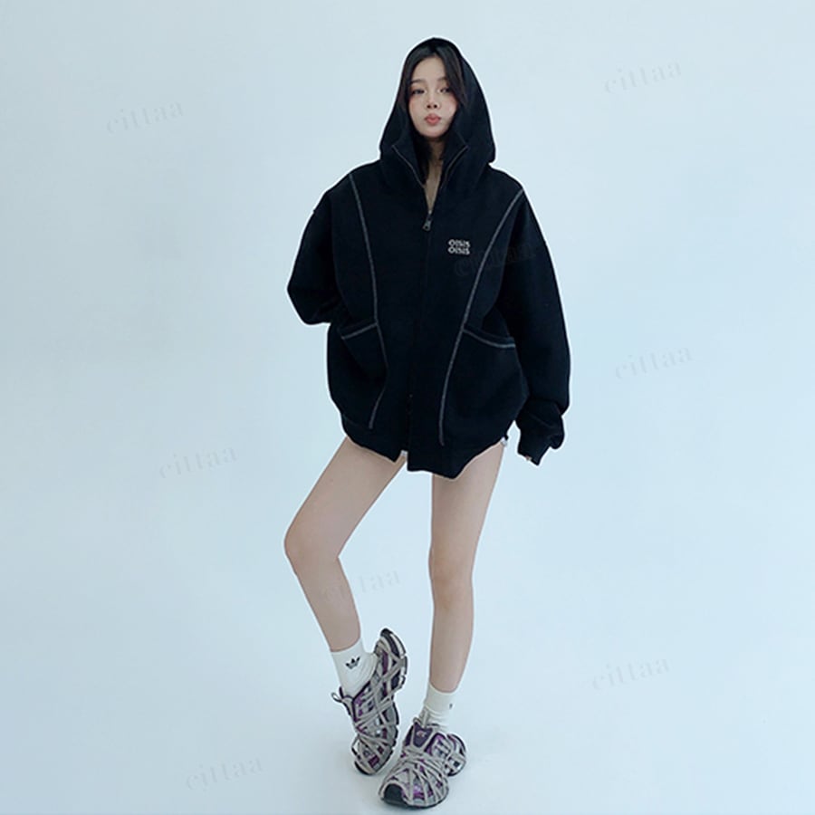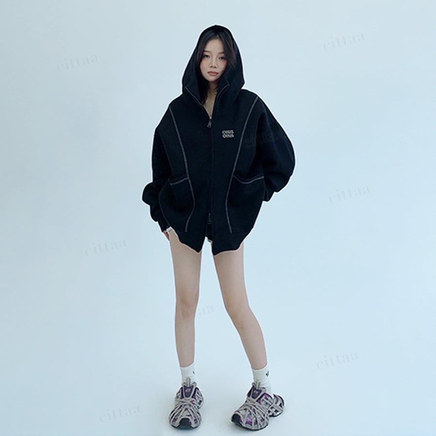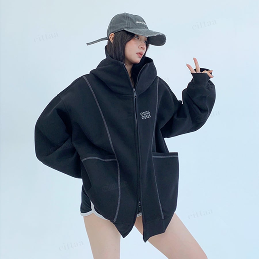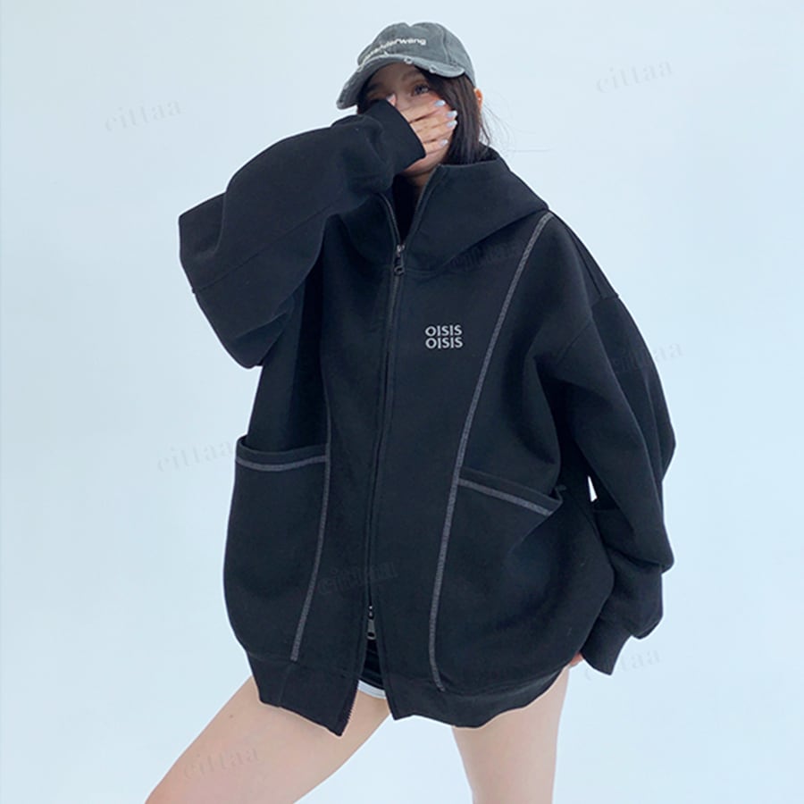 【即納】【早割限定特典10%OFF】D-385 2025秋新作♡OISIS配色パイピングダブルジップスウェットパーカー ブラック