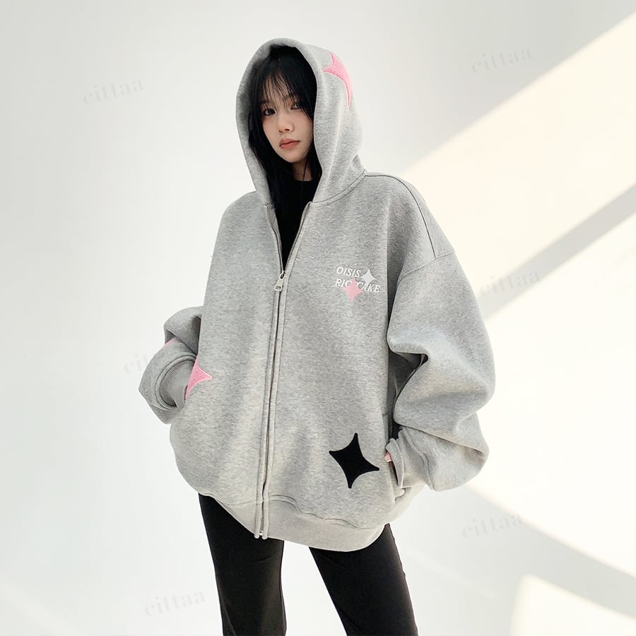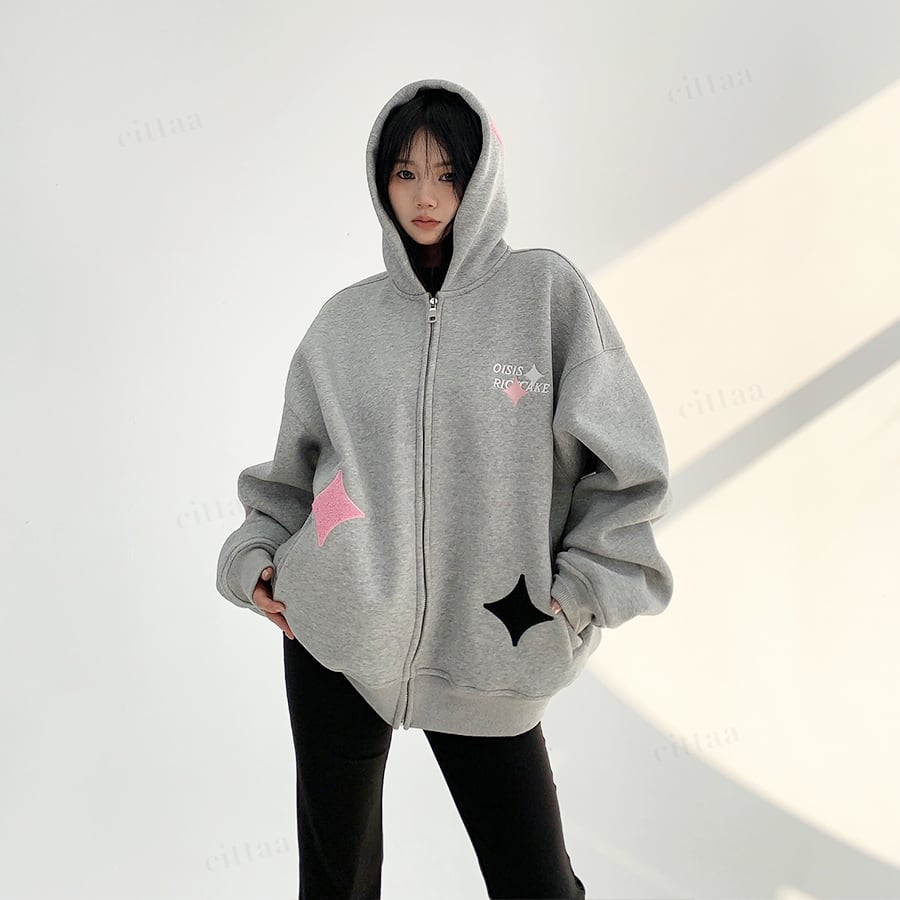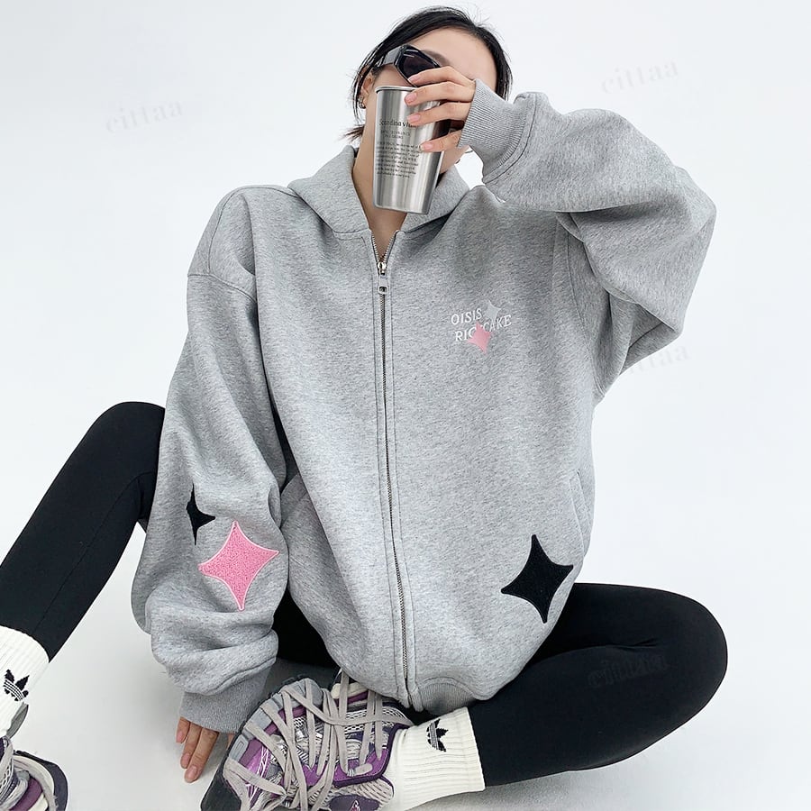 【即納】【早割限定特典10%OFF】D-387 2025秋新作♡OISISダイヤ刺繍デザインスウェットジップアップパーカー グレー