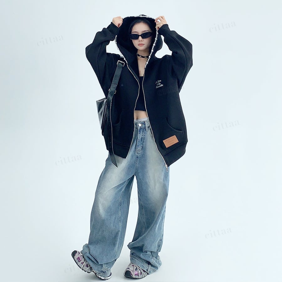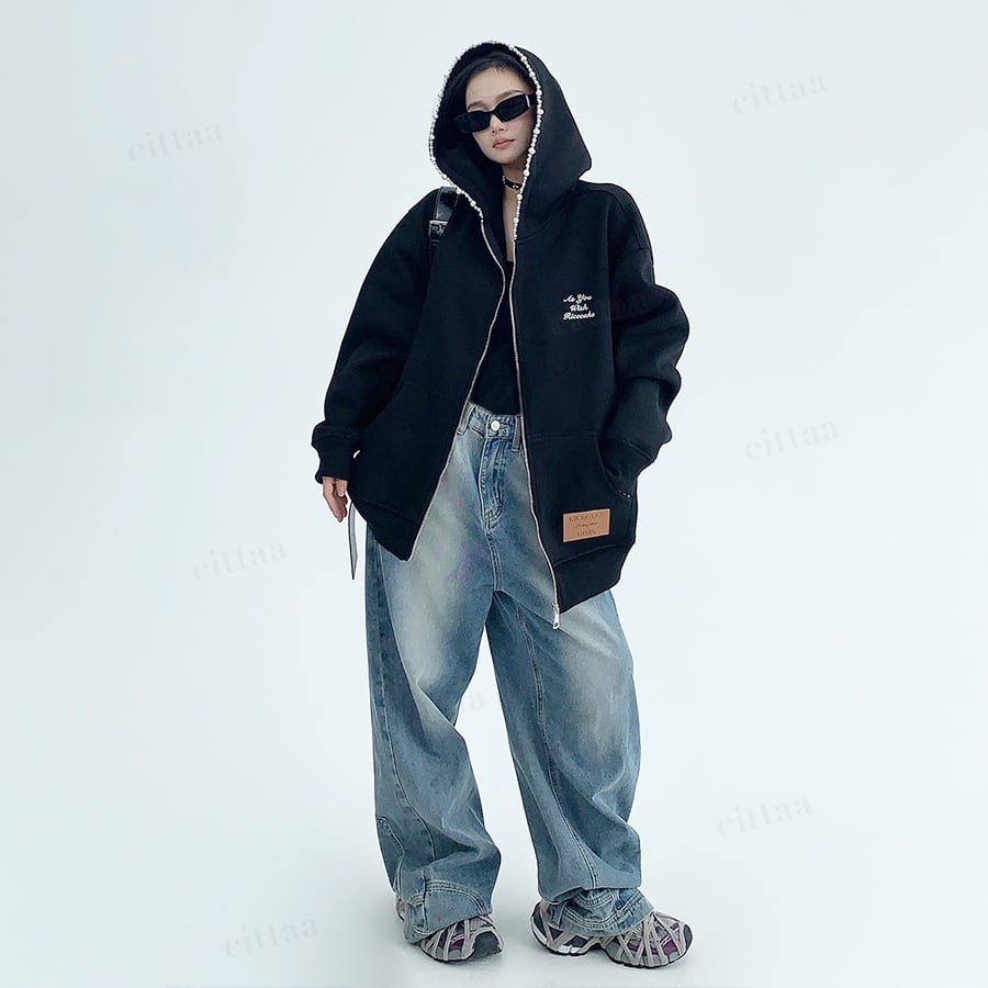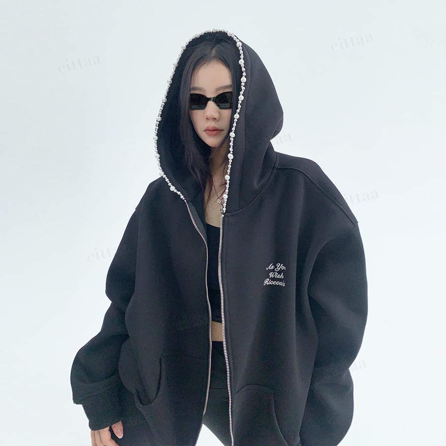 パールビーズで縁取ったフードデザインで差がつくジップアップパーカー♡