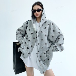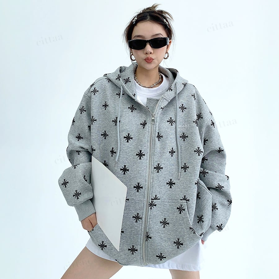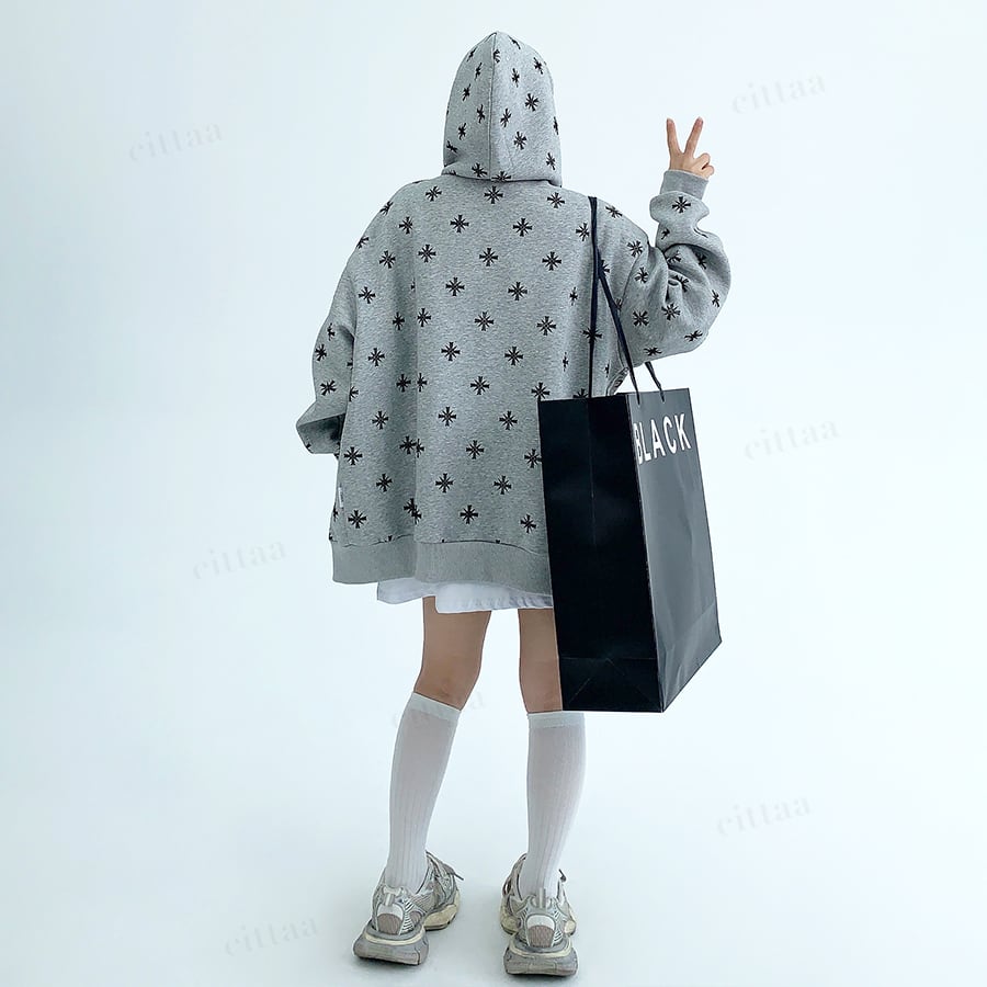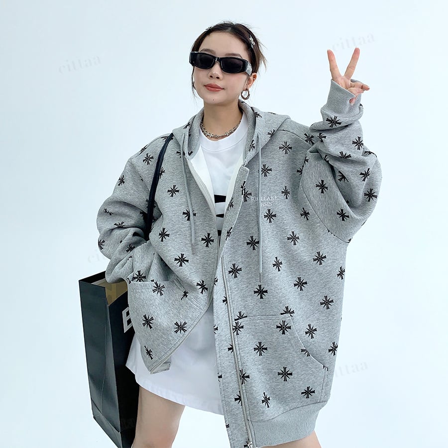 クロスプリントの総柄デザインが目を引く、ストリート感あふれるジップアップパーカー♡