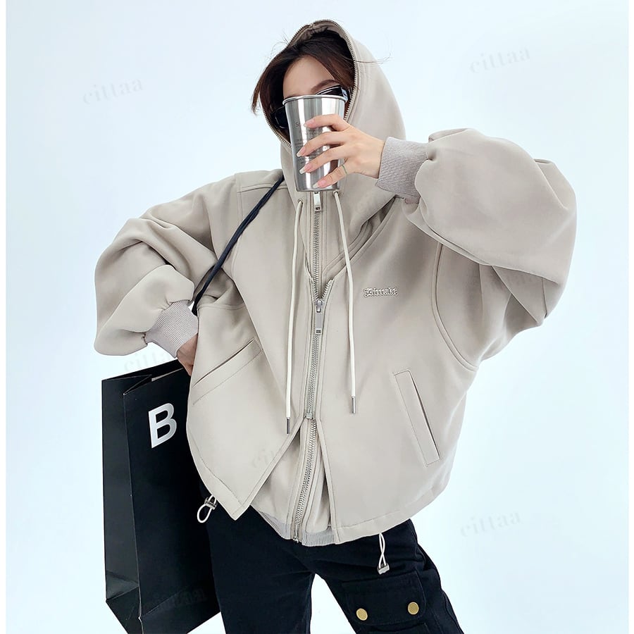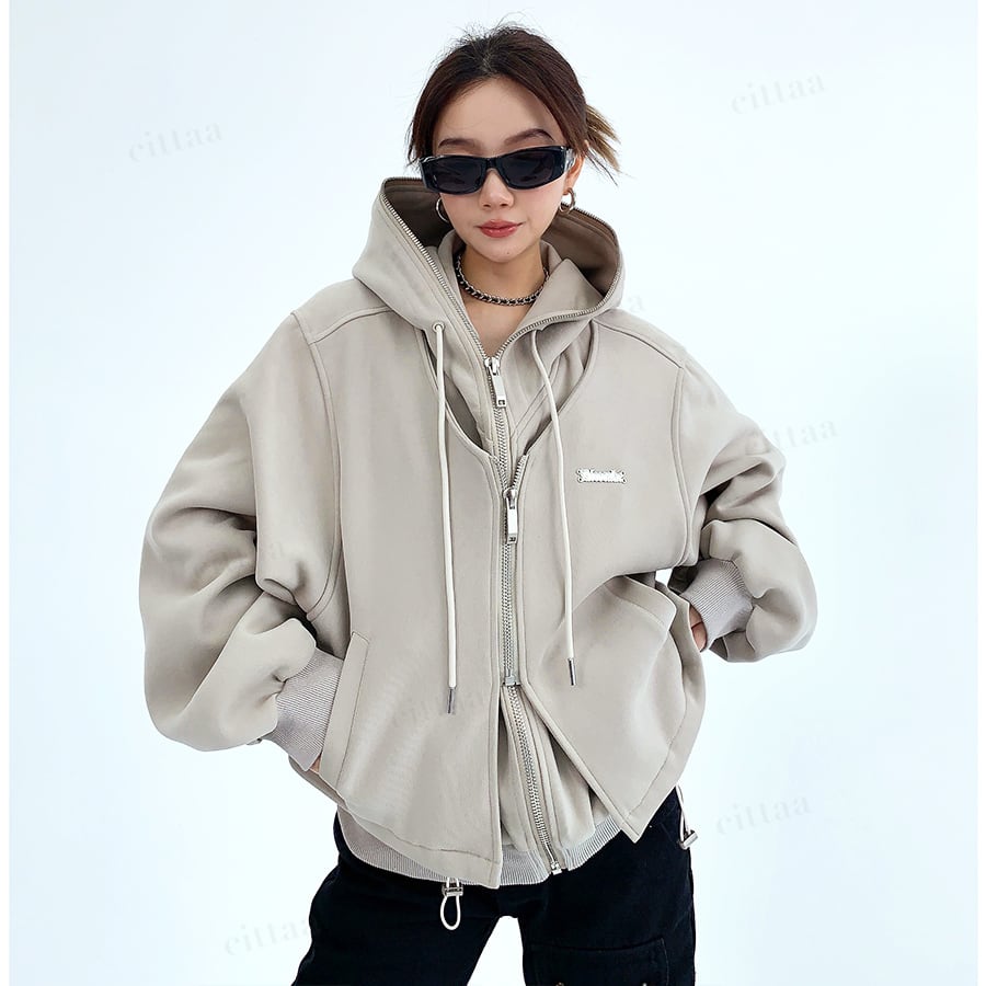★予約★【早割限定特典10%OFF】D-409 2025秋新作♡レイヤード風デザインジップアップパーカー アプリコット