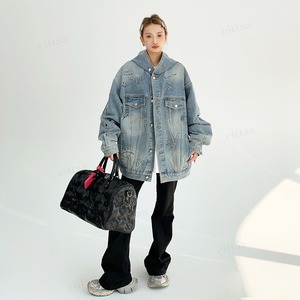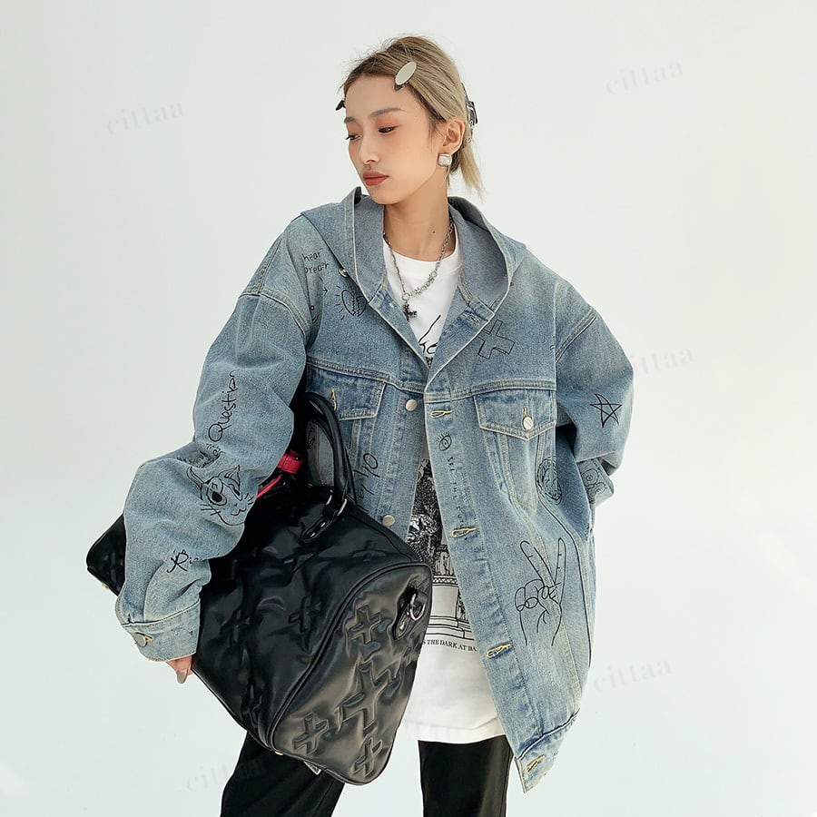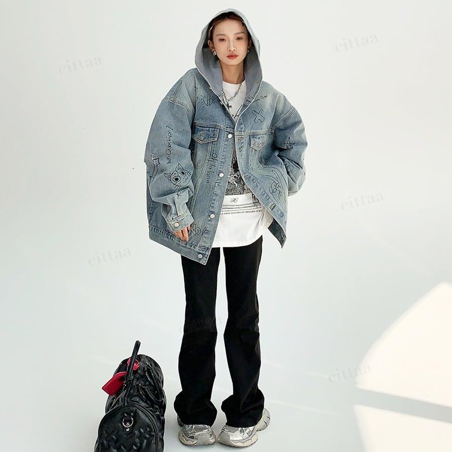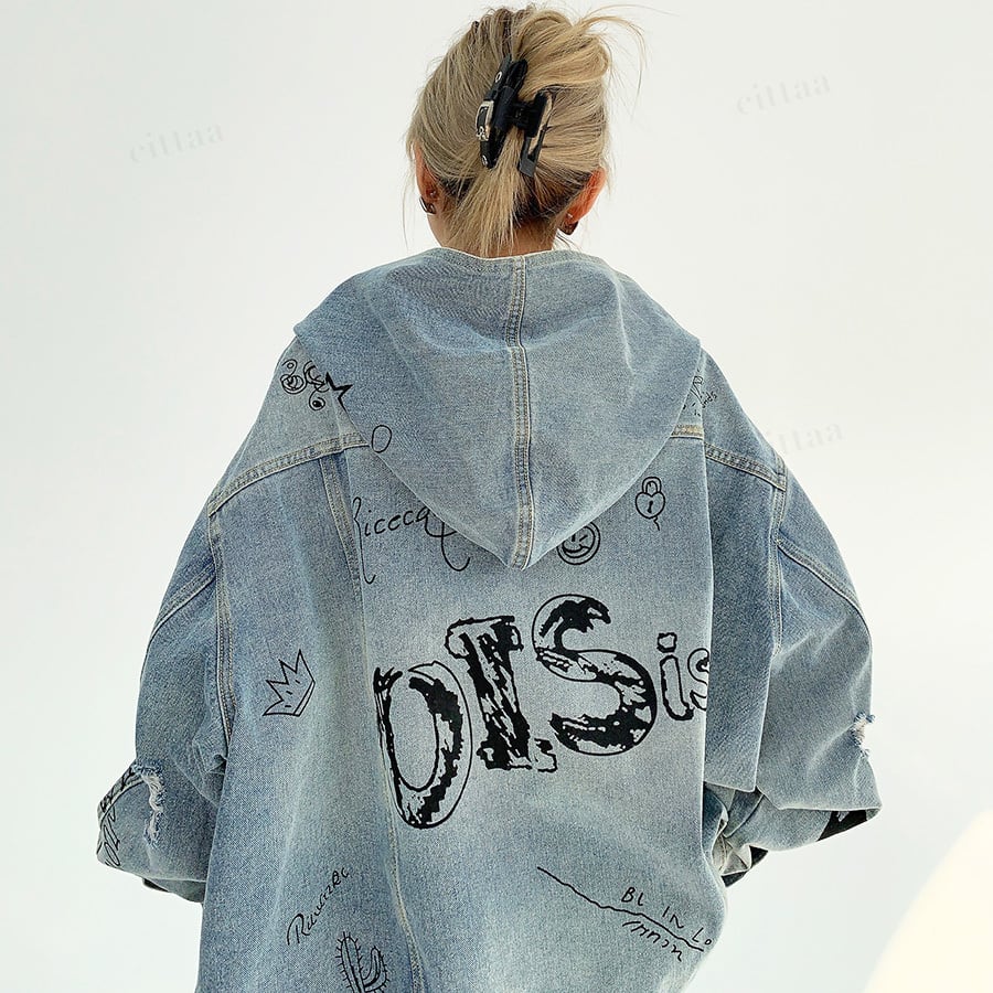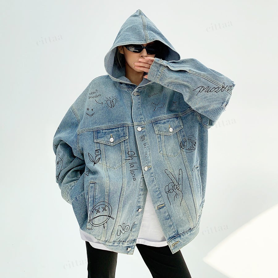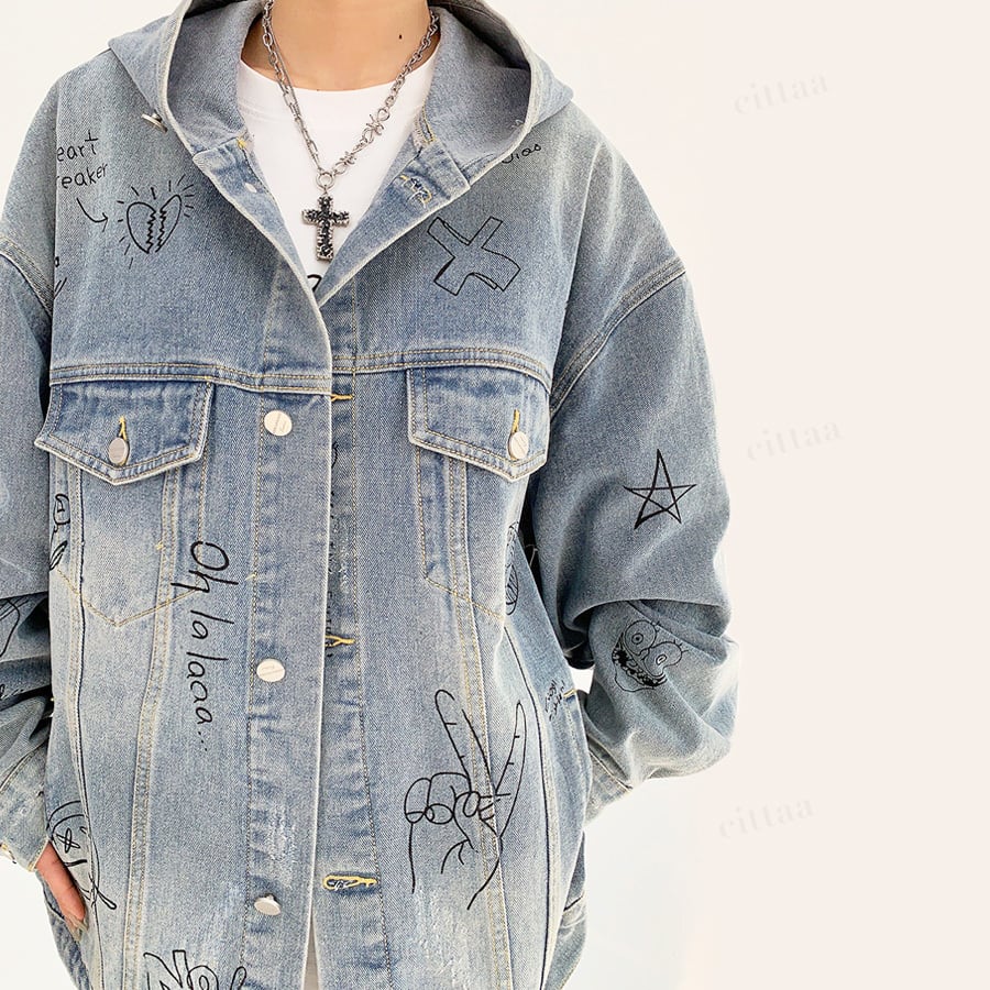 落書き風プリントで差がつくフード付きデニムジャケット♡