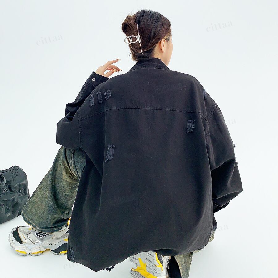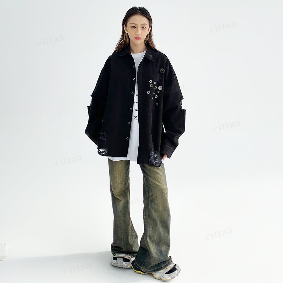 ★予約★D-425 2025秋新作♡ダメージ加工ボタンデザインワークシャツ ブラック
