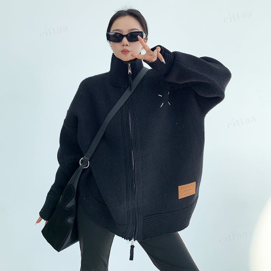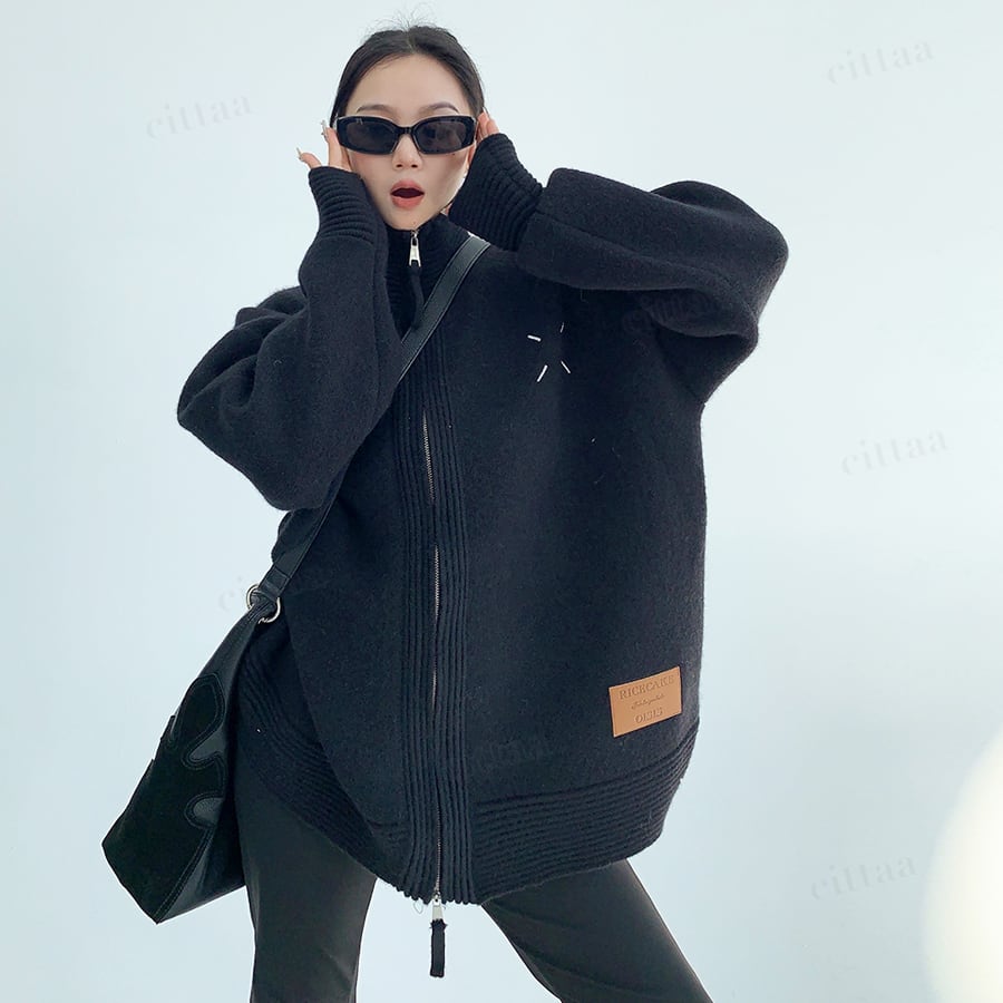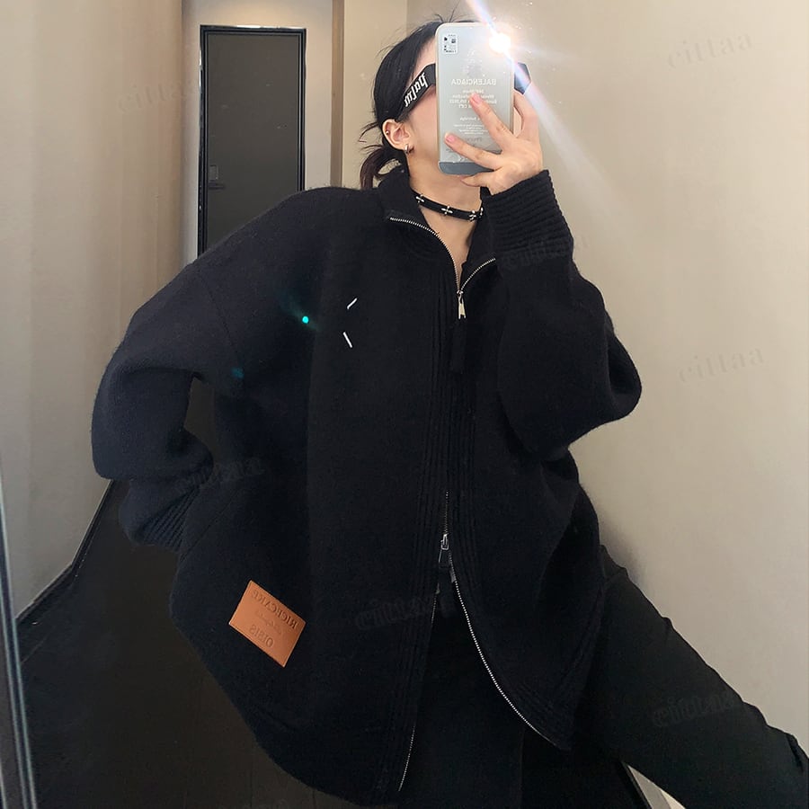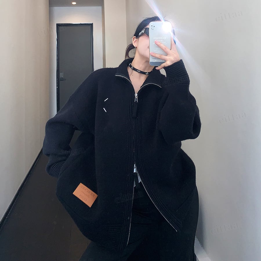 ★予約★D-744 2025秋冬新作♡OISISフェイクレザーラベルダブルジップニットカーディガン ブラック
