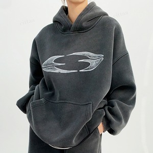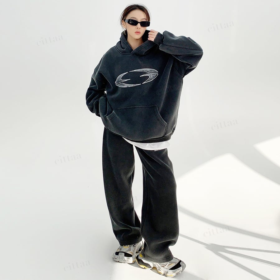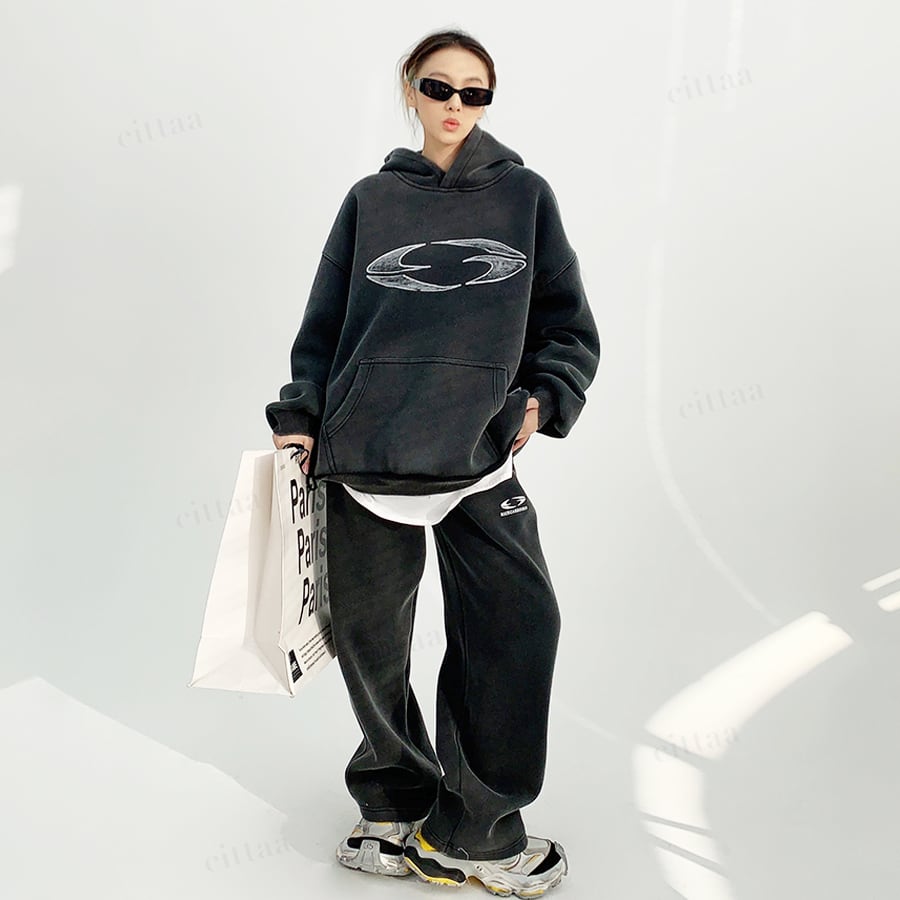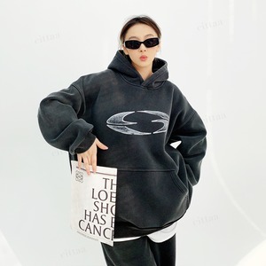 ★予約★D-443 2025秋新作♡【セットアップ可能】ヴィンテージ加工ストリートデザインフーディー ブラック