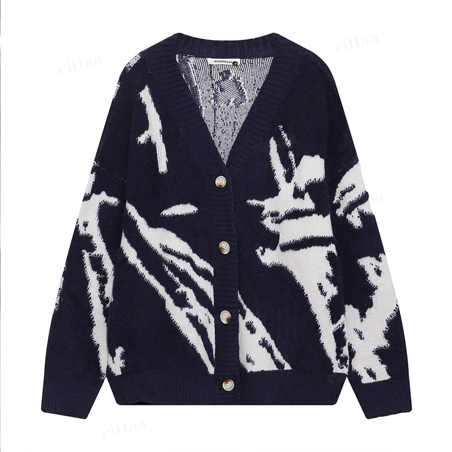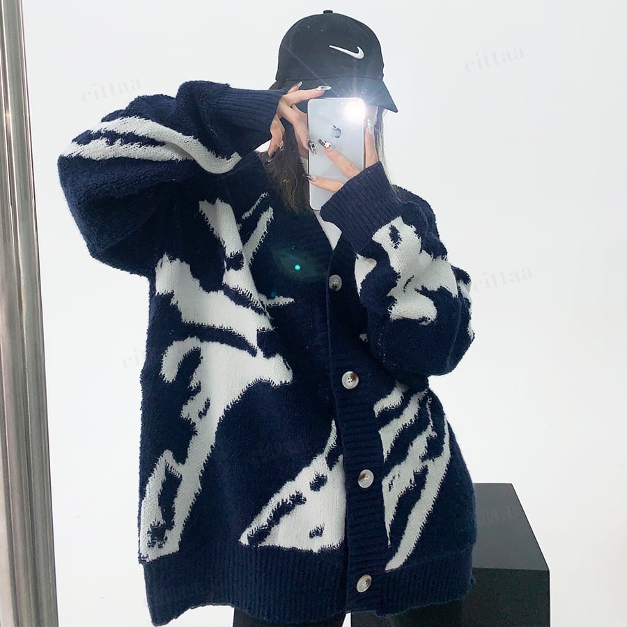 ★予約★【早割限定特典10%OFF】D-455 2025秋新作♡総柄ニットカーディガン ネイビーブルー
