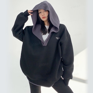 ★予約★D-521 2025秋新作♡RICECAKE配色ニットVネックフーディー ブラック