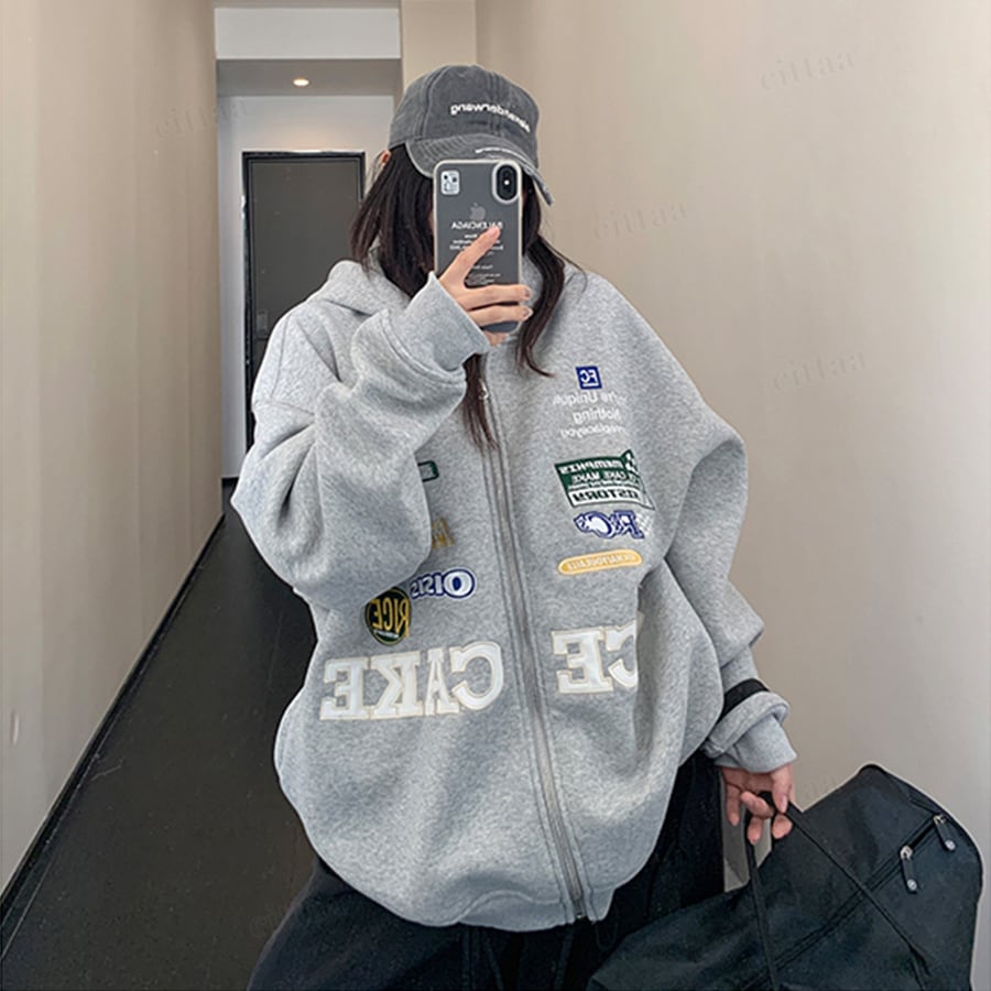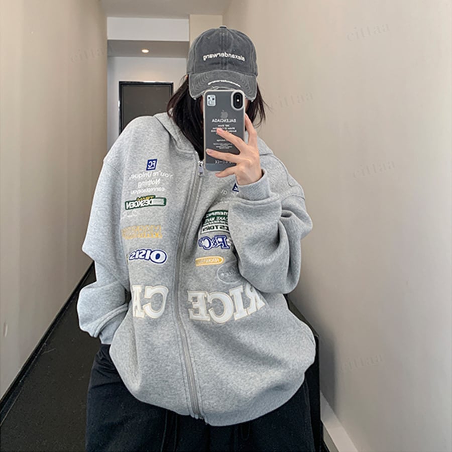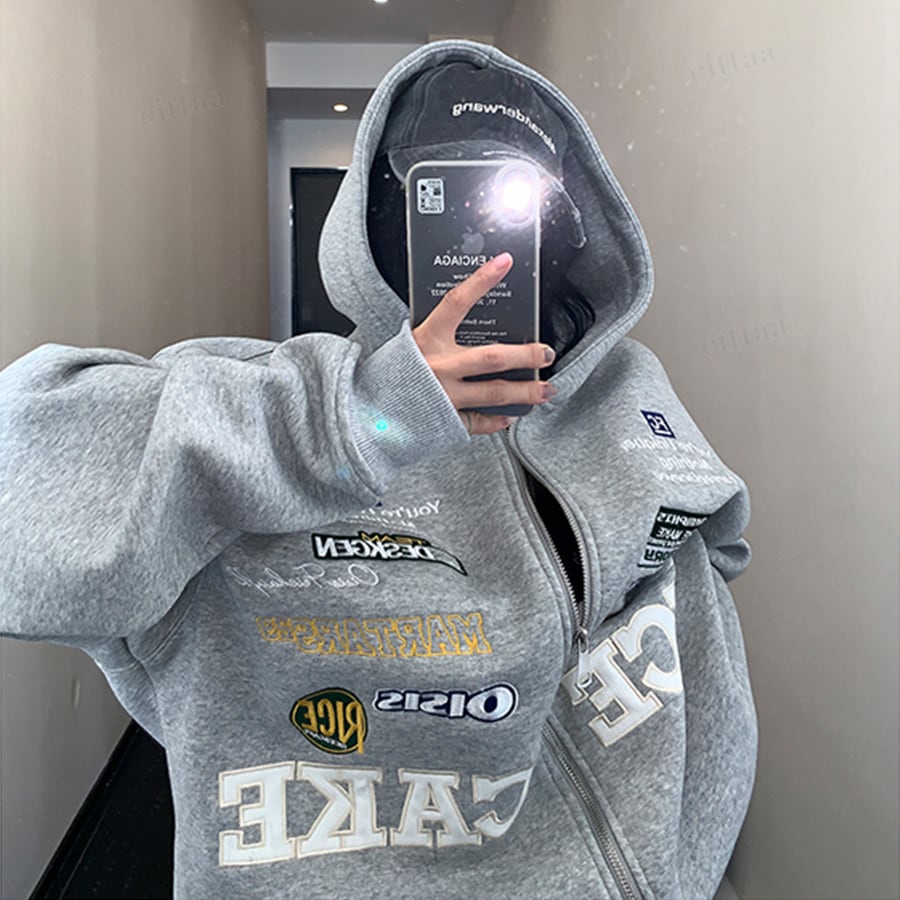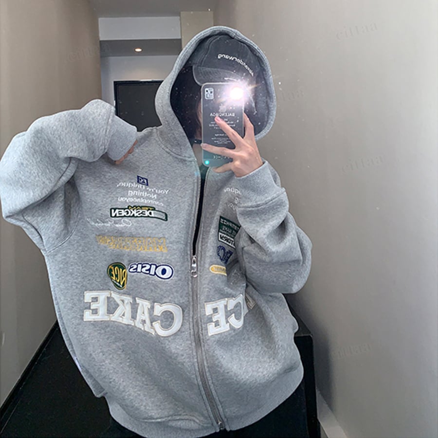 ★予約★D-526 2025秋新作♡RICECAKEスポンサー風刺繍デザインジップアップパーカー グレー