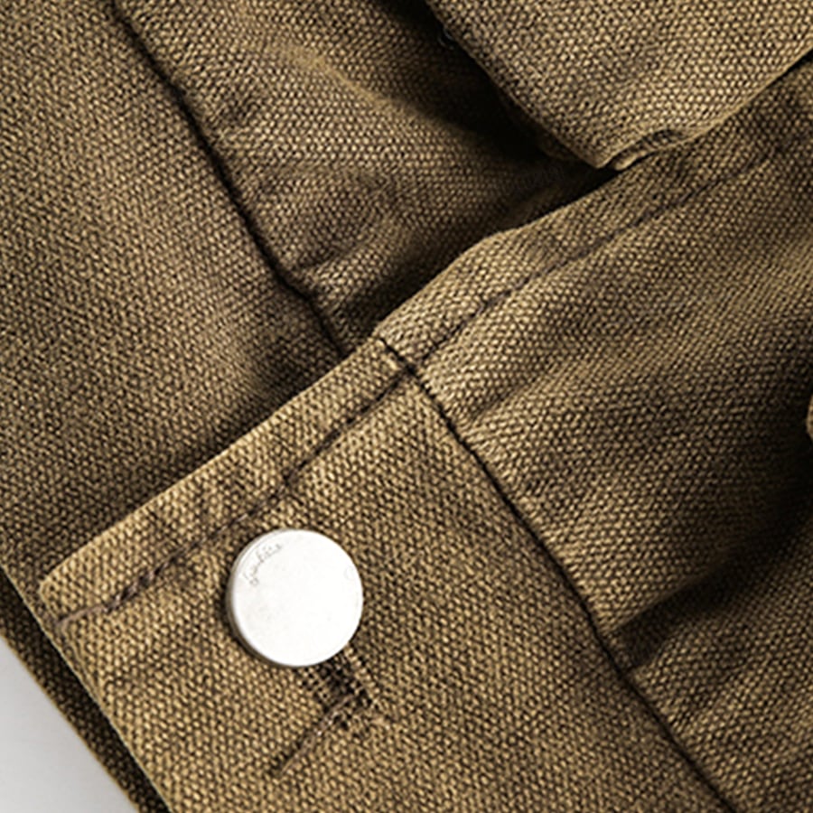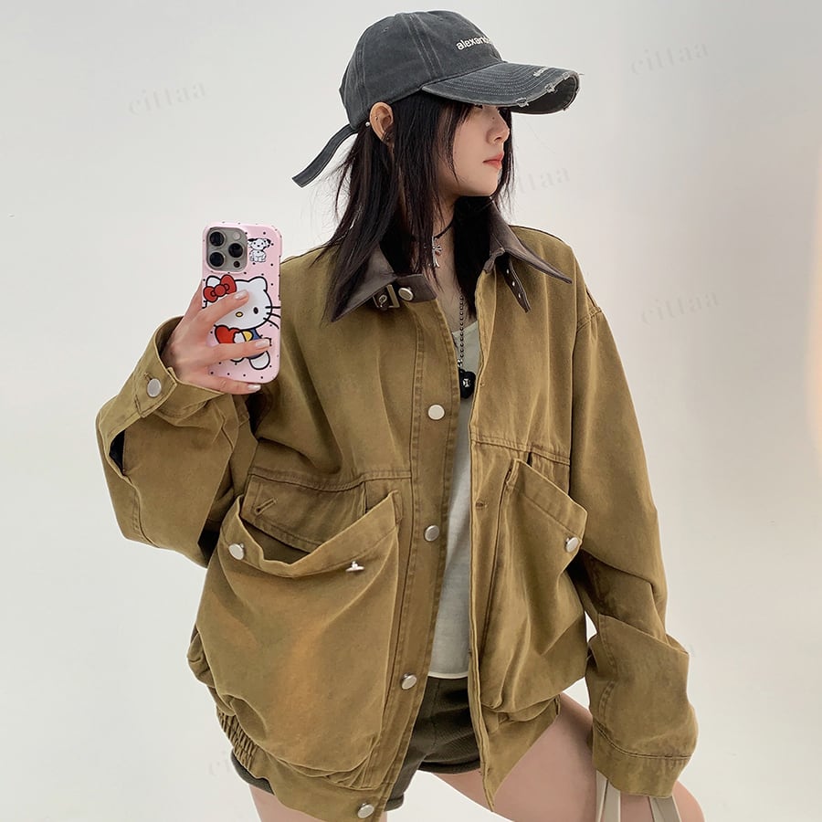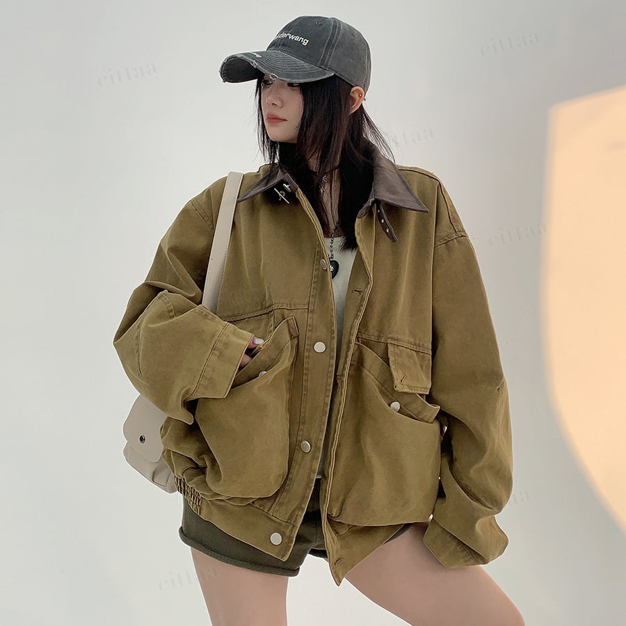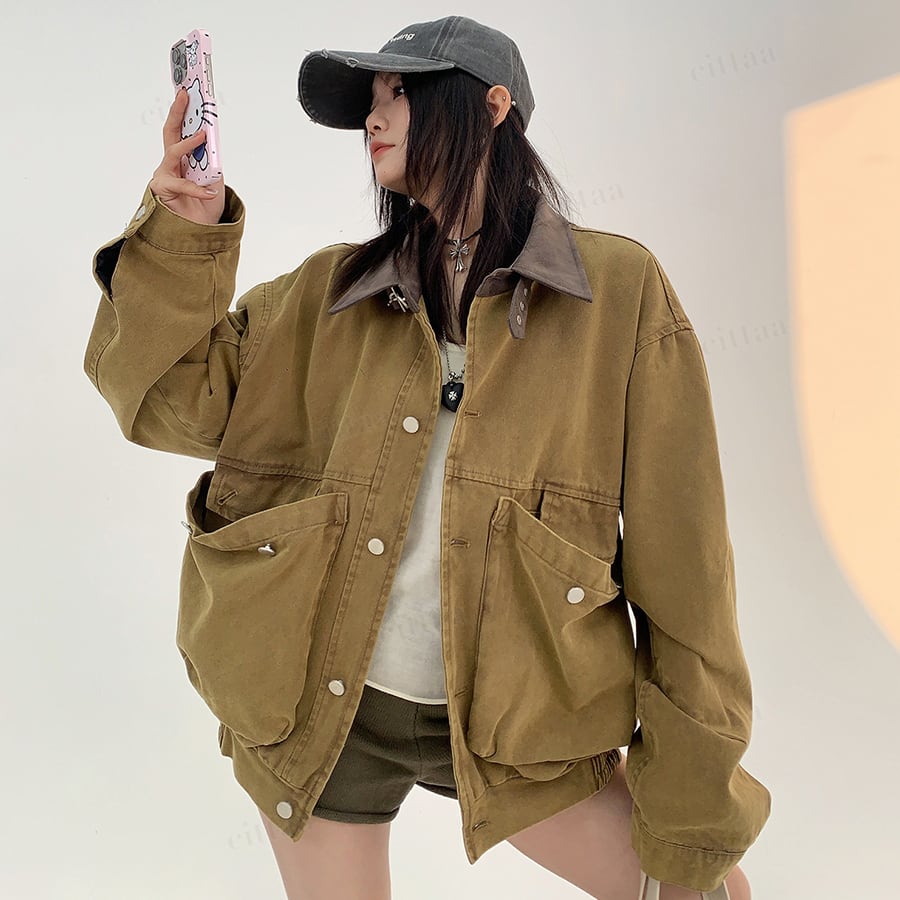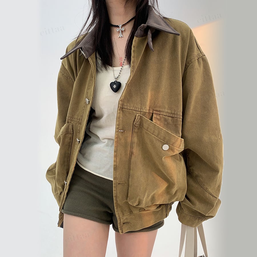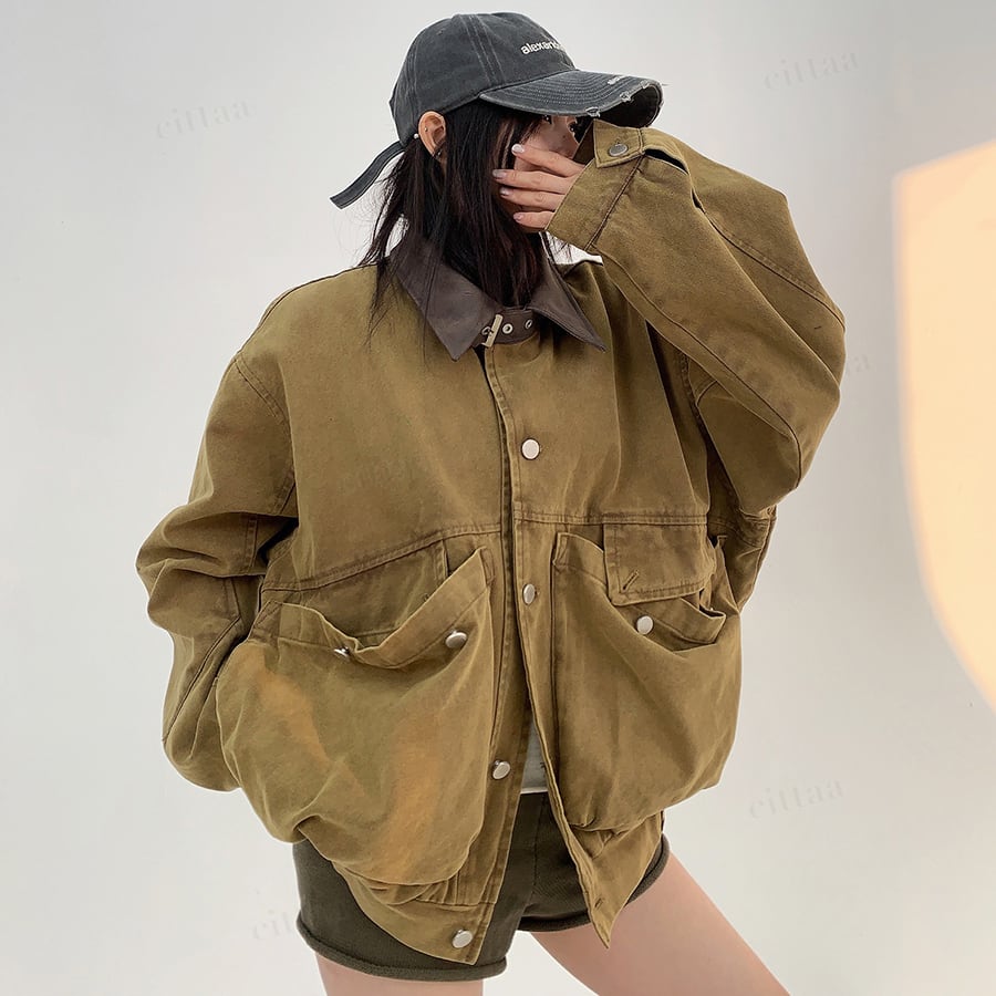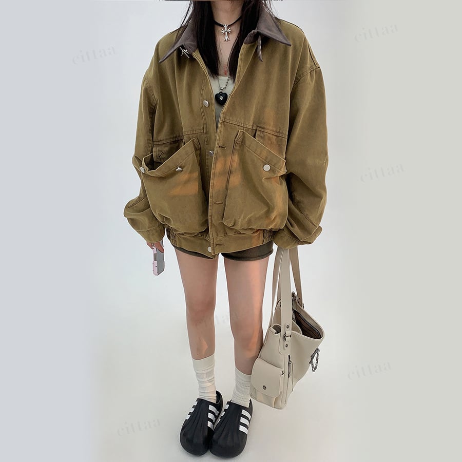 大きめポケットがデザインの主役に。襟元のバイカラーがさりげないアクセントになり、古着ライクな雰囲気漂う一枚。羽織るだけでコーデがサマになります。
