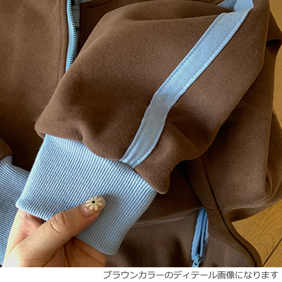 サッと羽織れて気温調整しやすいジップアップタイプ。フロントを閉めるとハイネックになり、首元までしっかり防寒できるのも嬉しいポイント。
