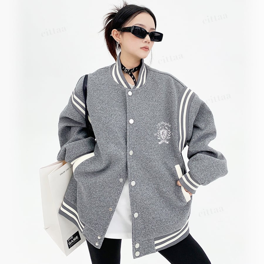 落ち着いた色味で合わせやすく、スポーティーながらも上品な印象に。前開きボタンでさっと羽織れるので、季節の変わり目や肌寒い日にも大活躍します。カジュアルなパンツスタイルから、スカートとのMIXコーデまで幅広く対応。