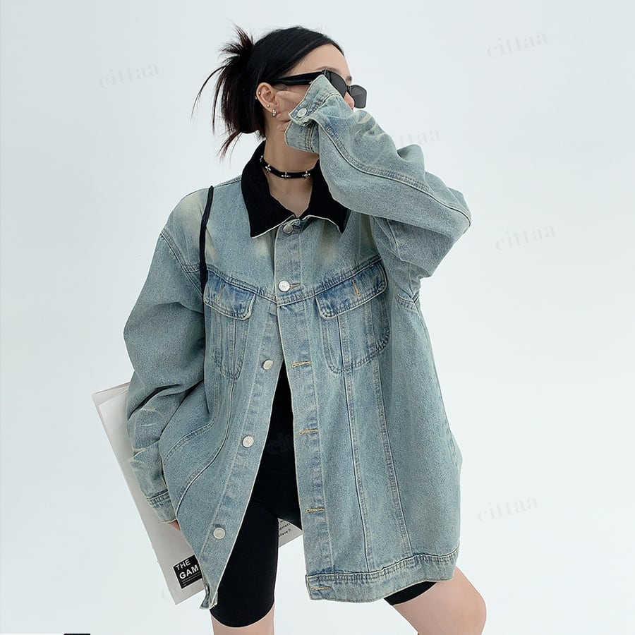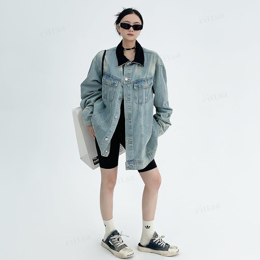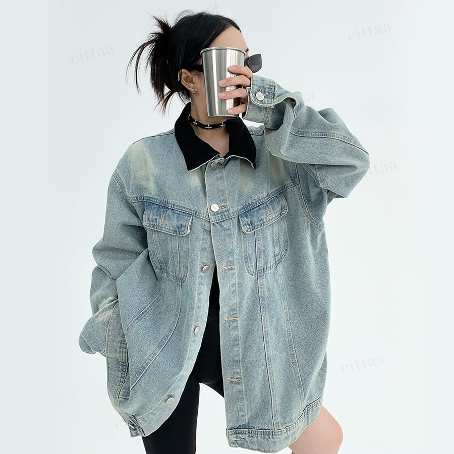 ★予約★D-551 2025秋冬新作♡RICECAKEバックロゴコーデュロイ襟デニムブルゾン ライトブルー