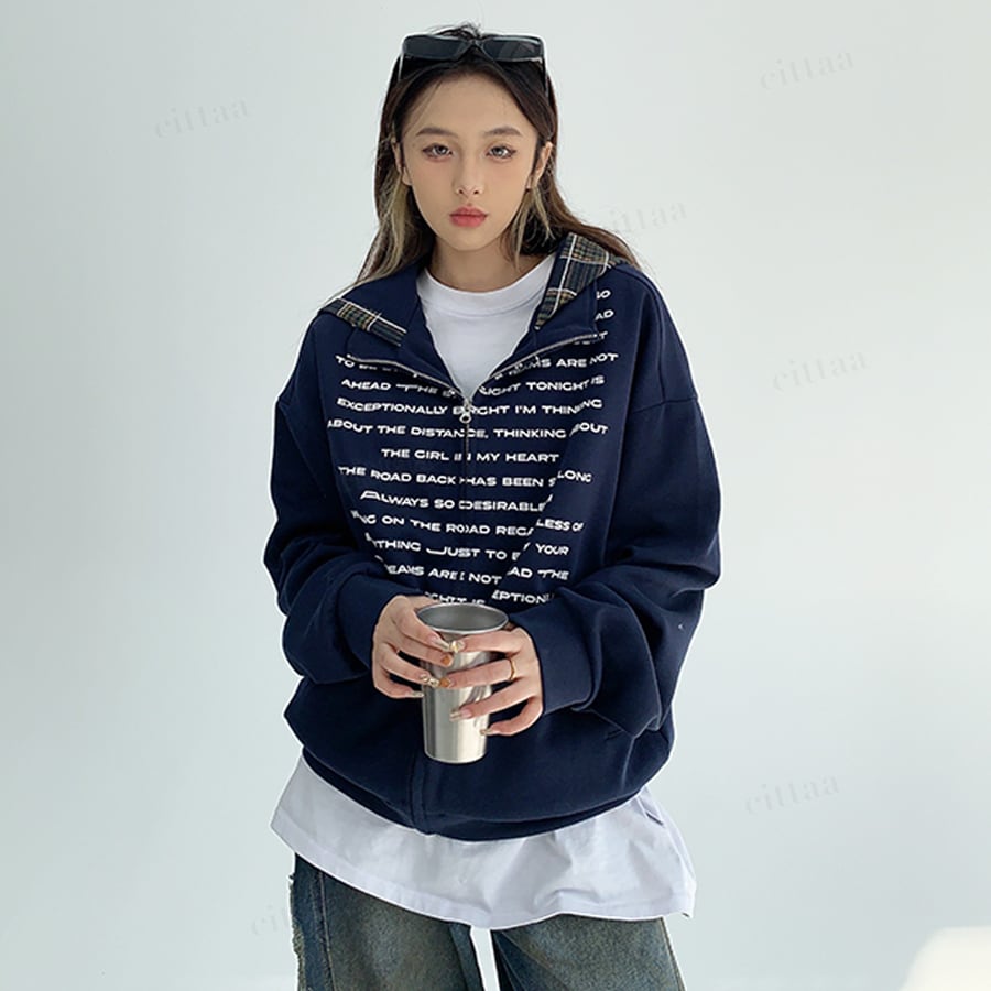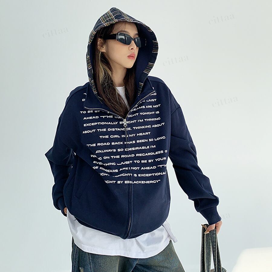 ★予約★D-552 2025秋新作♡チェック柄フード英字プリントジップアップパーカー ネイビー