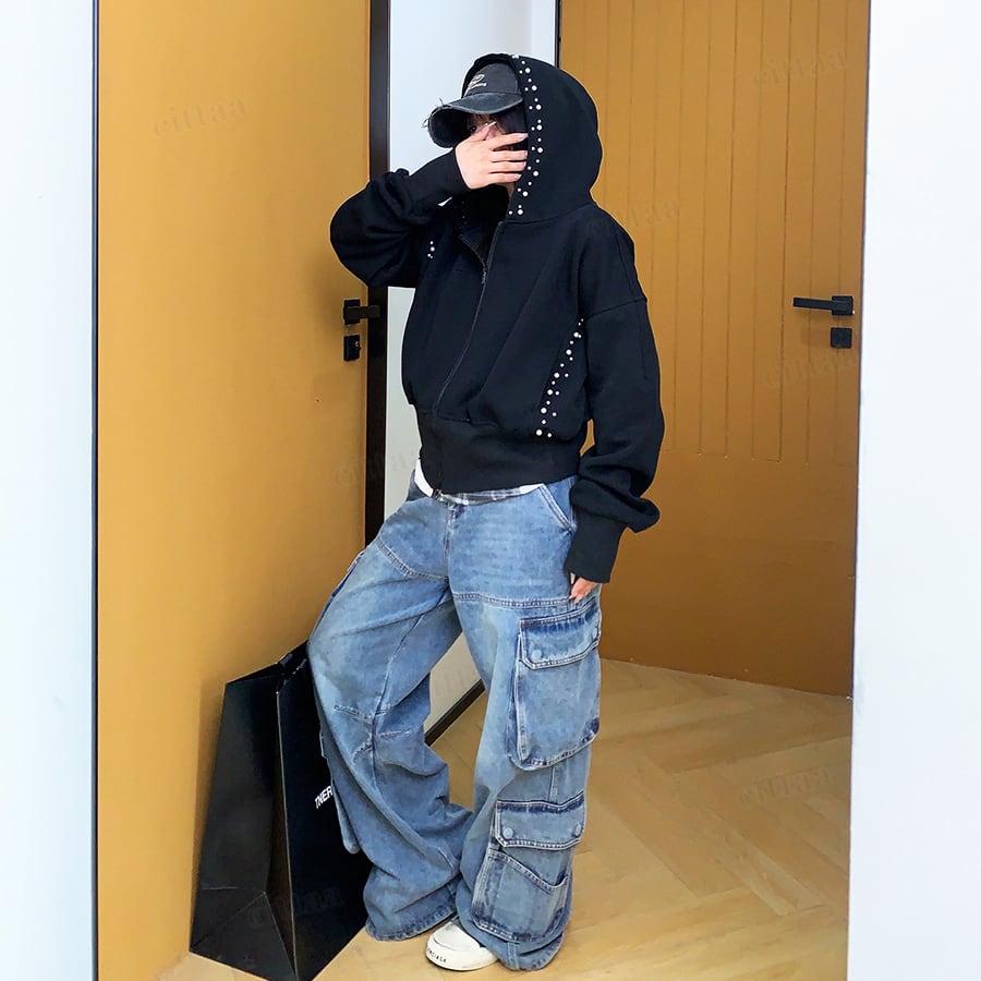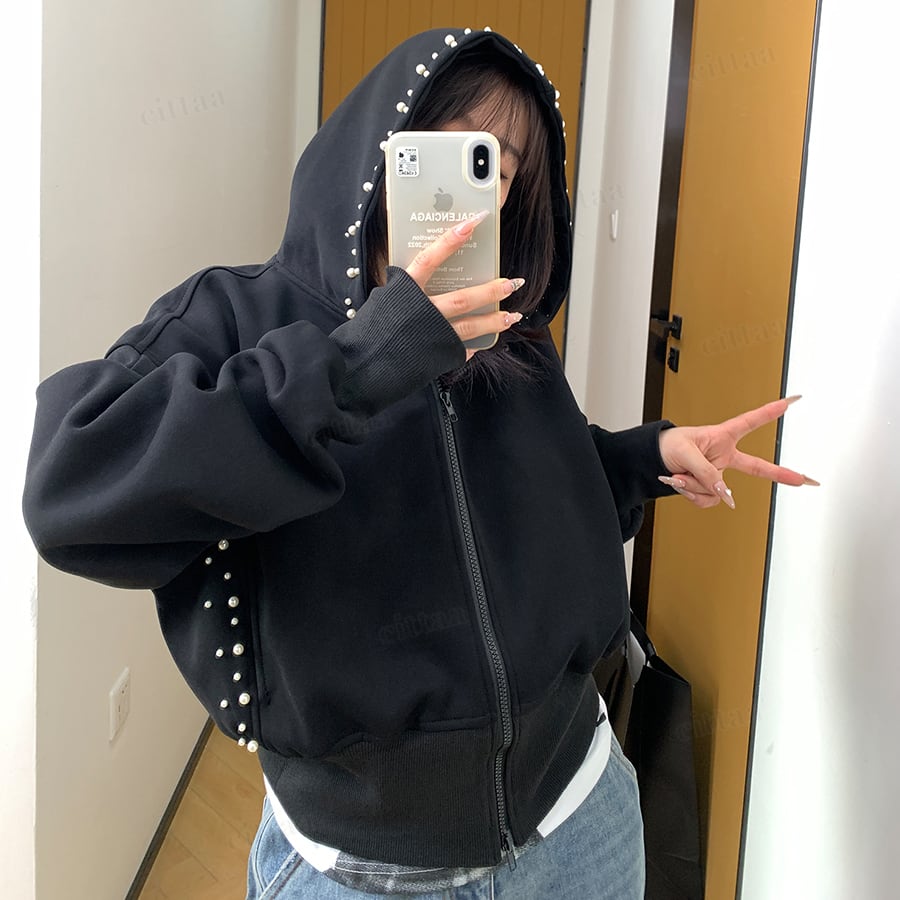 ★予約★D-561 2025秋新作♡パールラインクロップド丈ダブルジップパーカー ブラック