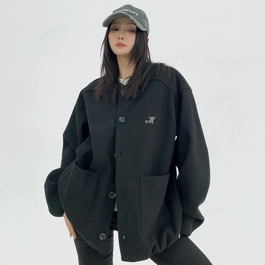 ★予約★D-568 2025秋新作♡M刺繍ロゴノーカラーブルゾンコート ブラック