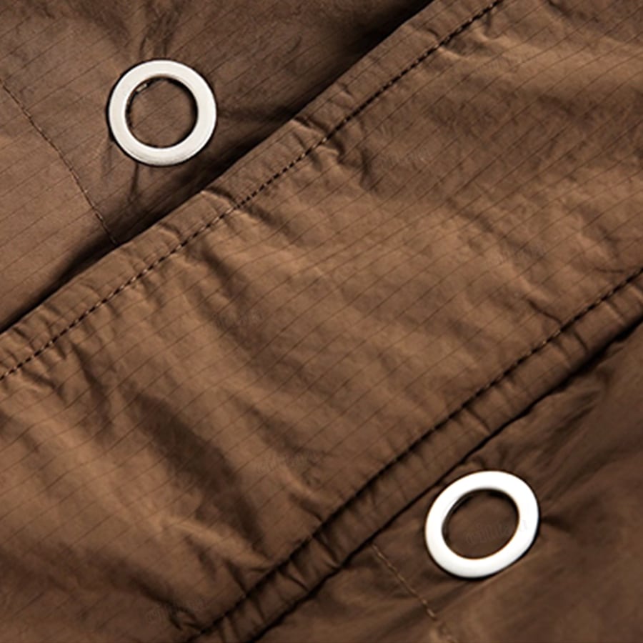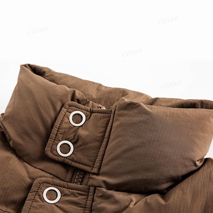 フロントはボタンとファスナーの2重構造。上まで閉めればハイネックになり、首元までしっかり防寒できます。
