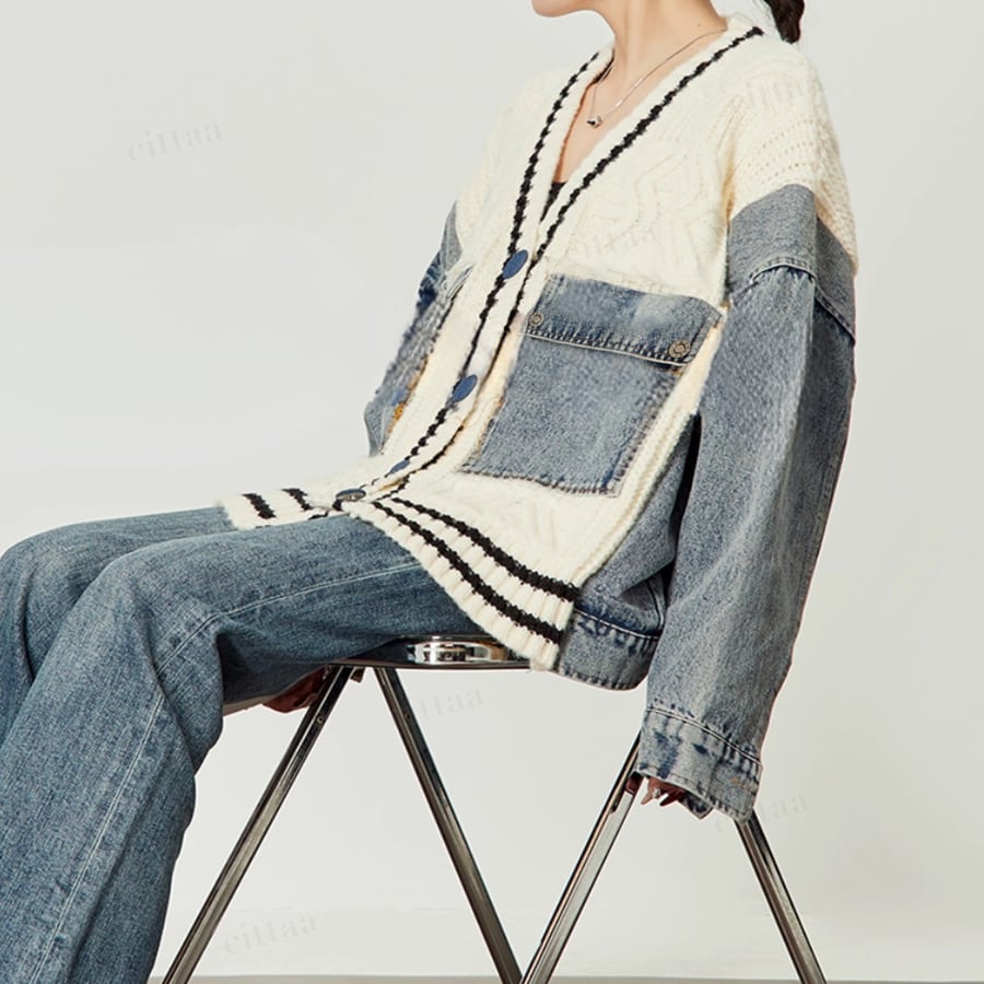 着映え感抜群デニム×ニットドッキングデザインジャケット♡