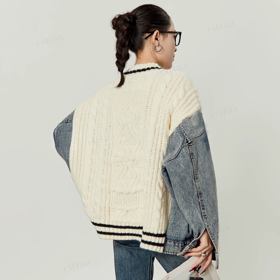 ★予約★D-579 2025秋新作♡デニムドッキングVネックニットカーディガン ホワイト