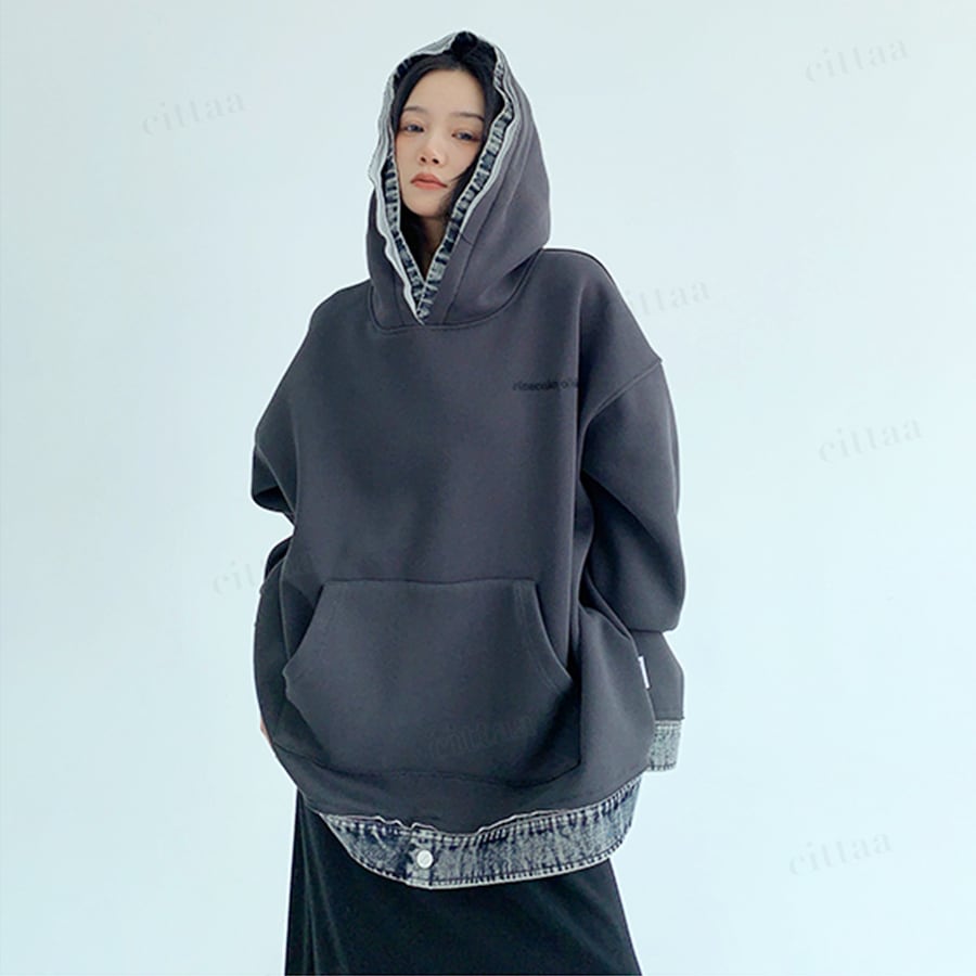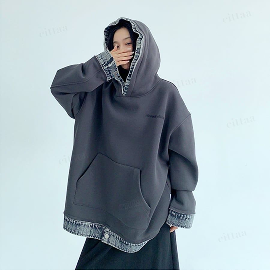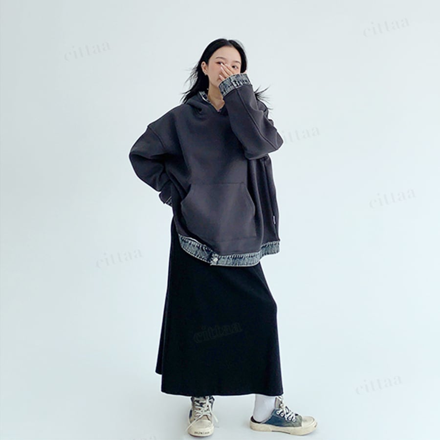 ★予約★D-747 2025秋新作♡ricecakeデニムレイヤード風デザインフーディー ダークグレー