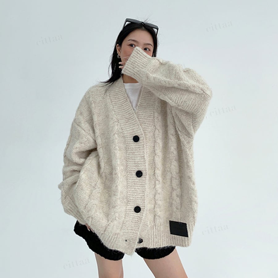 裾に施されたフェイクレザーのラベルがさりげないアクセントに。立体感のあるケーブル編みデザインが、どの角度から見てもおしゃれ見え。シンプルすぎず、程よく存在感のあるカーディガンです。