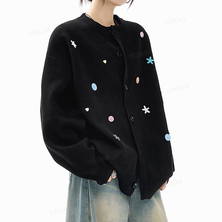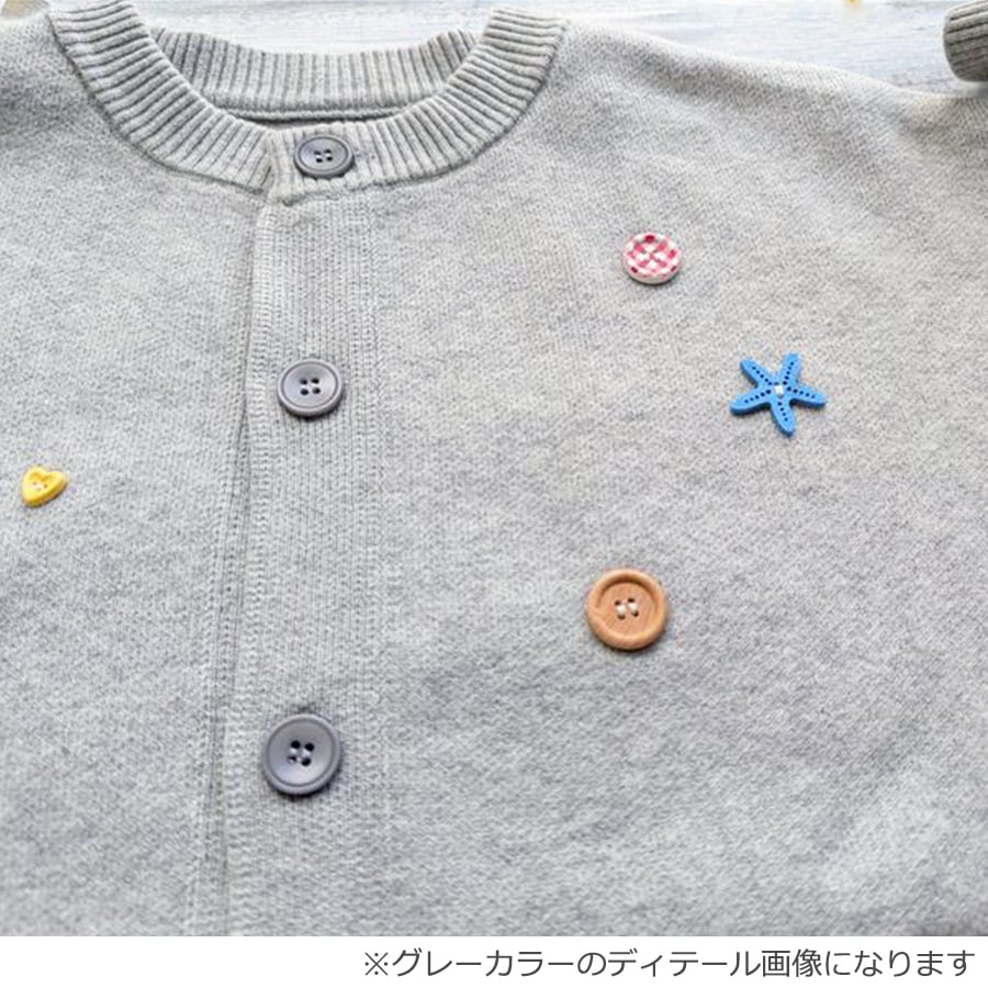 丸だけでなく、ハートやフラワーなど個性豊かなボタンをランダムに配置。カラフルな色使いが目を引き、羽織るだけで着映え感抜群◎