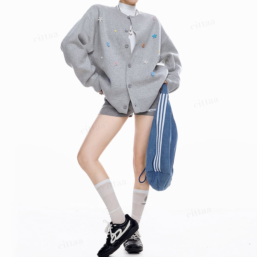 丸だけでなく、ハートやフラワーなど個性豊かなボタンをランダムに配置。カラフルな色使いが目を引き、羽織るだけで着映え感抜群◎
