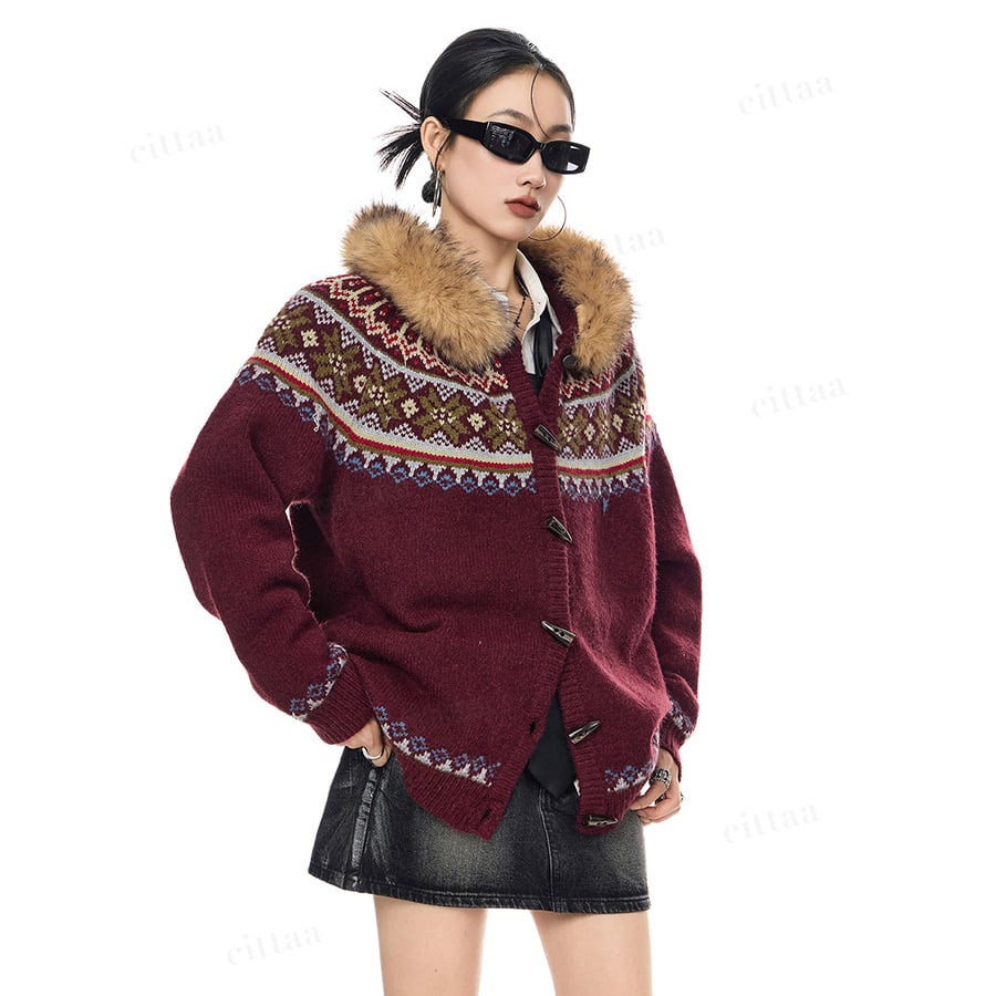 【即納】【早割限定特典10%OFF】D-605 2025秋新作♡ファー付きフードノルディックカーディガン レッド 1010