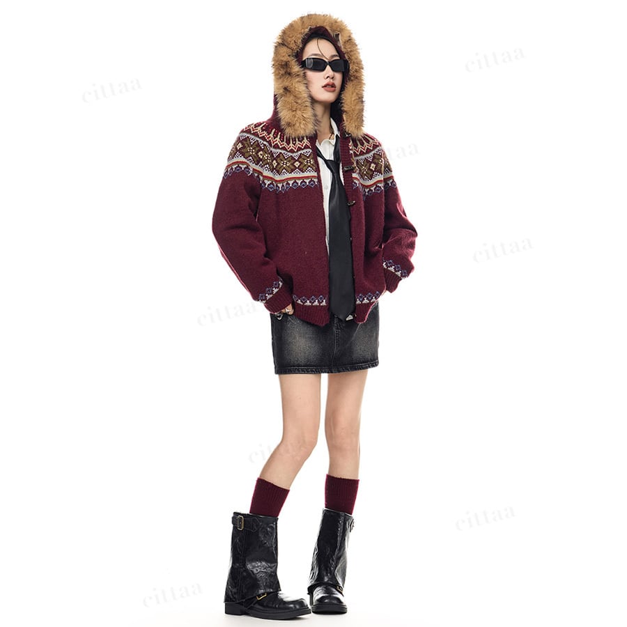 シーズンムードたっぷりノルディック柄フード付きニットカーディガン♡