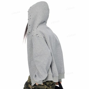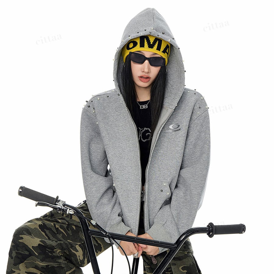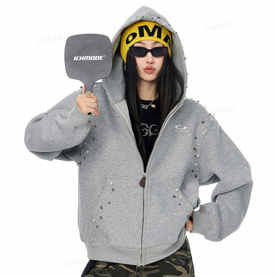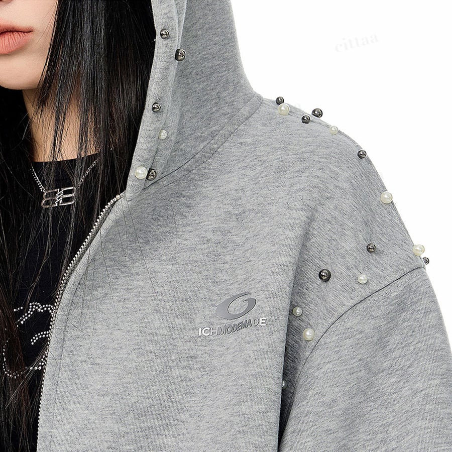 【即納】【早割限定特典10%OFF】D-607 2025秋新♡ICHMODEMADEパールスタッズジップアップパーカー グレー 1010