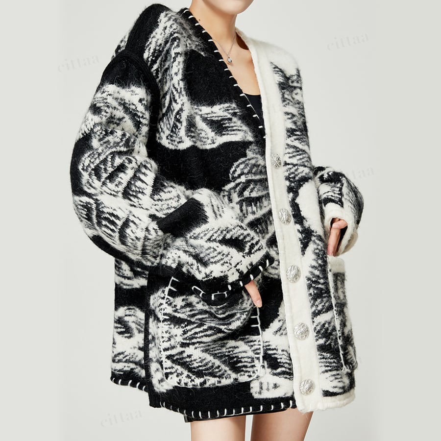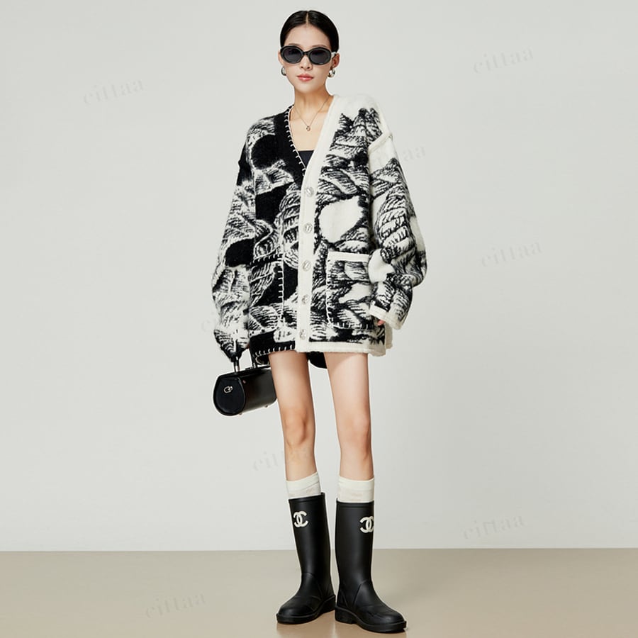 【即納】【早割限定特典10%OFF】D-581 2025秋新作♡ROPEアシンメトリー柄ニットカーディガン ブラック 1010