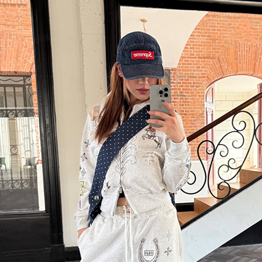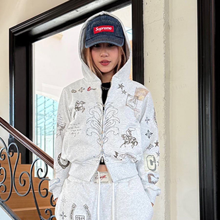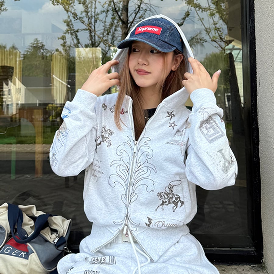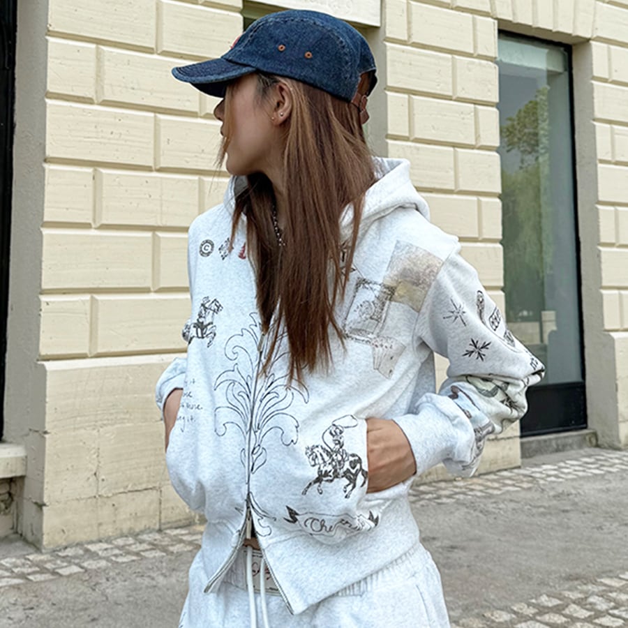 ★予約★D-634 2025秋新作♡落書きプリントダブルジップアップパーカー ホワイトライトグレー