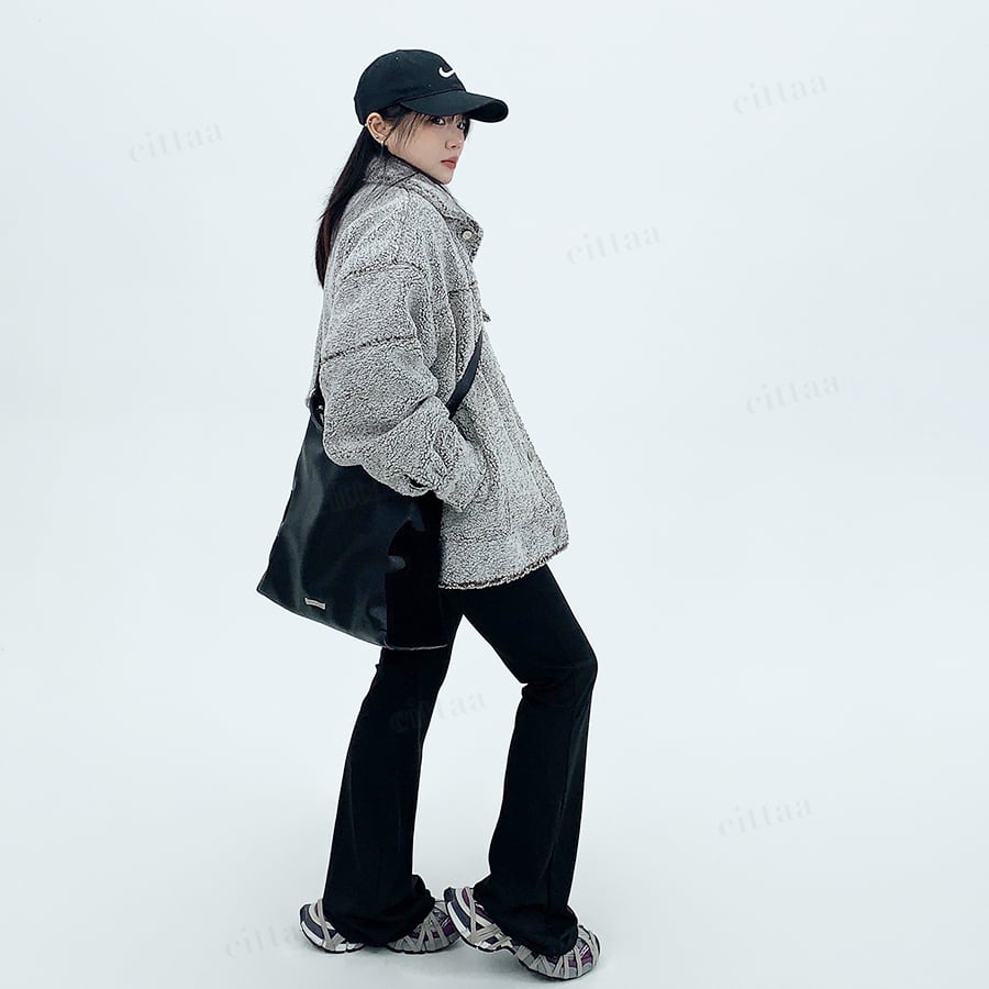 ふわっとしたボア素材で秋冬らしい雰囲気たっぷり。背中にあしらったさりげないラベルデザインが、おしゃれなアクセントに◎