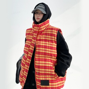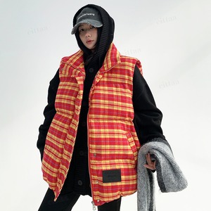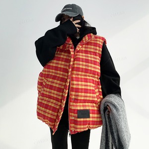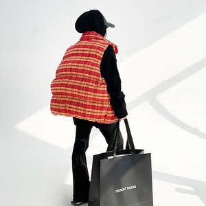 ★予約★D-668 2025秋新作♡フェイクレザーラベル付きチェック柄中綿入りベスト