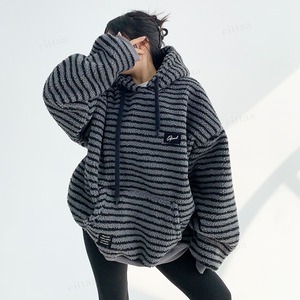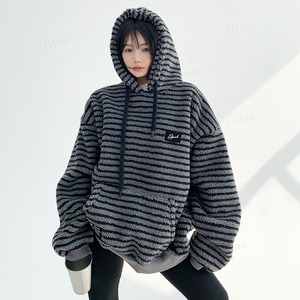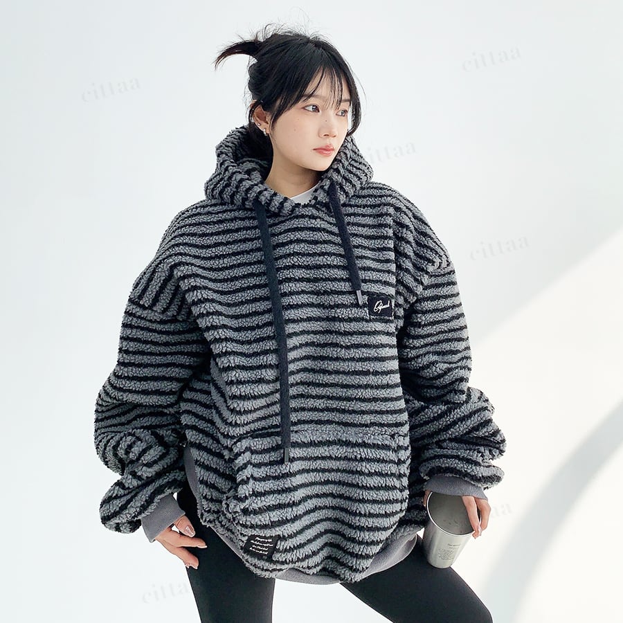 ★予約★D-659 2025秋新作♡ラベル付きボーダー柄ボアフーディー ブラック×グレー