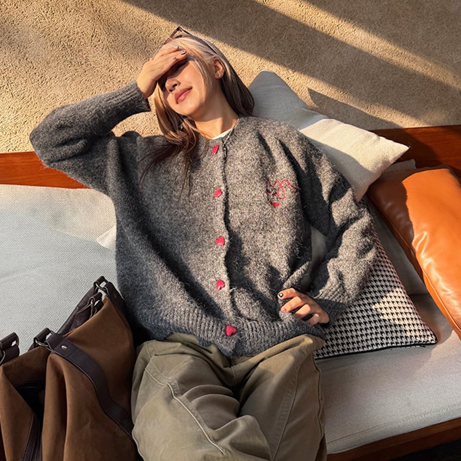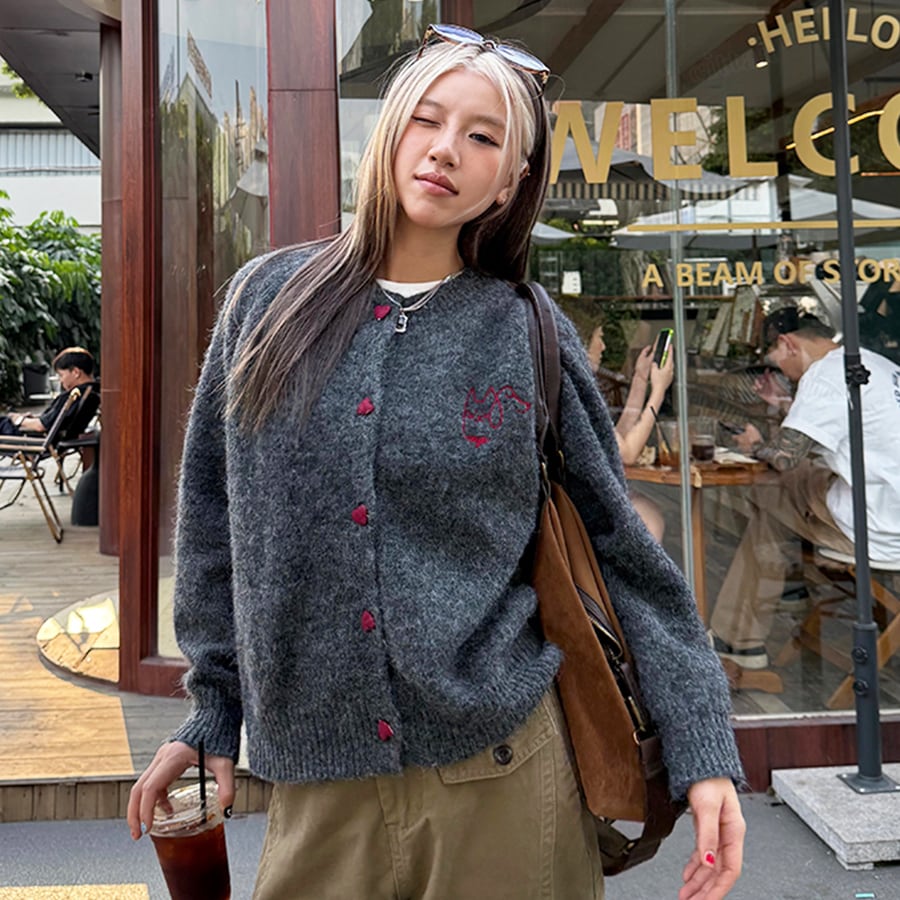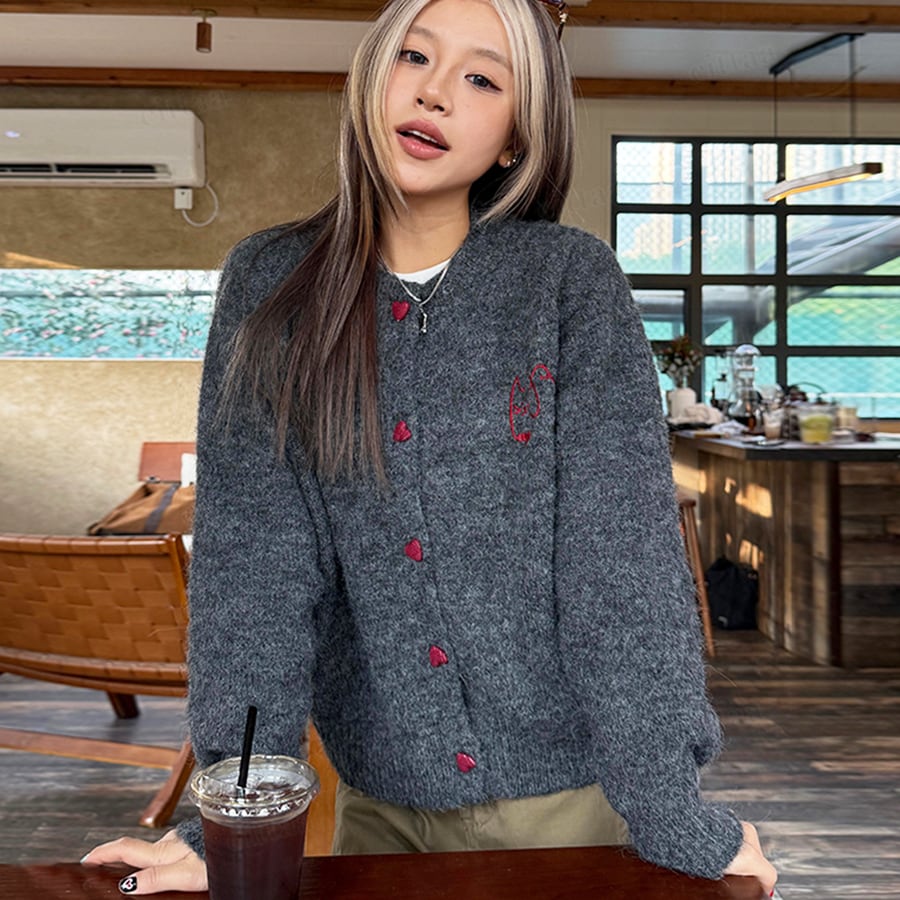 ★予約★D-650 2025秋新作♡刺繍デザインハートボタンニットカーディガン ダークグレー