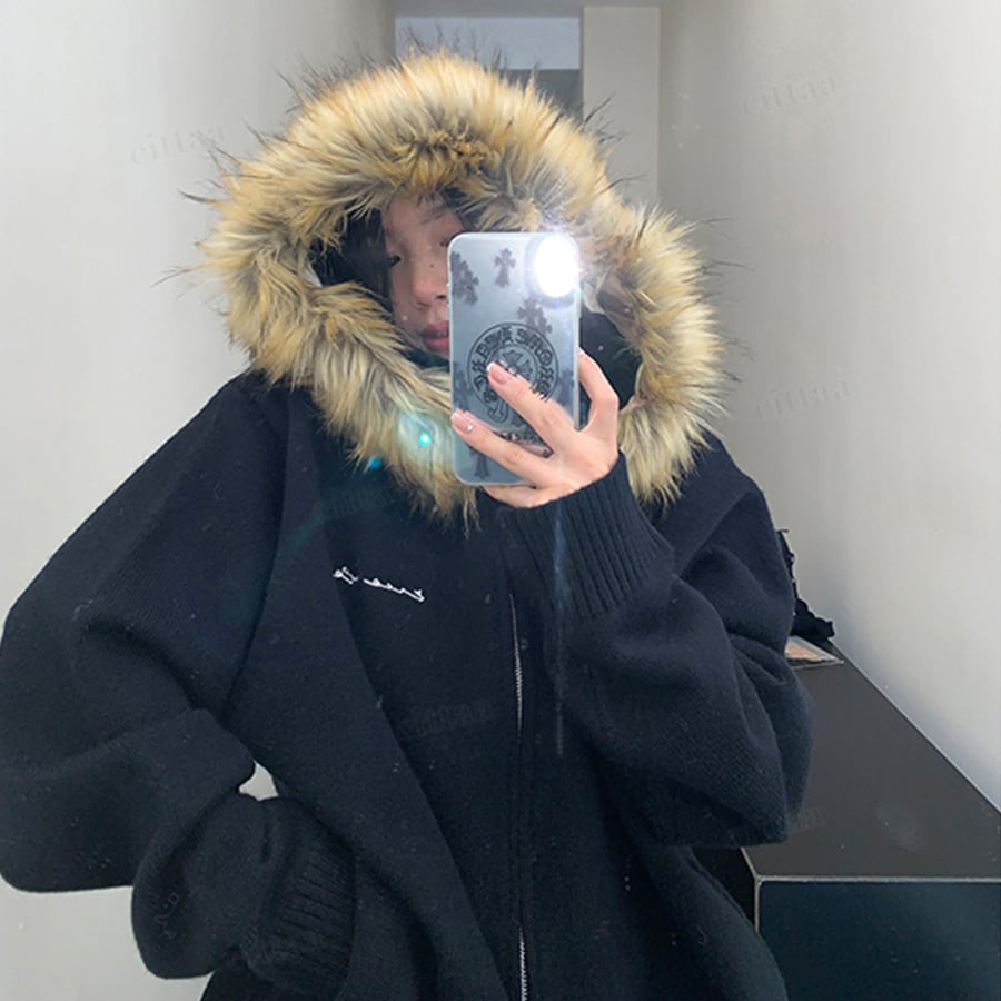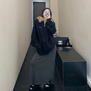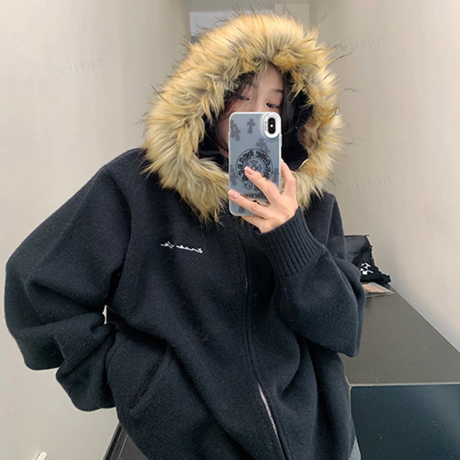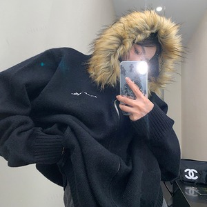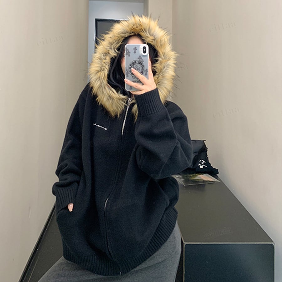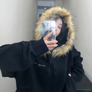 ★予約★D-678 2025秋新作♡ファー付きフードジップアップニットパーカー ブラック