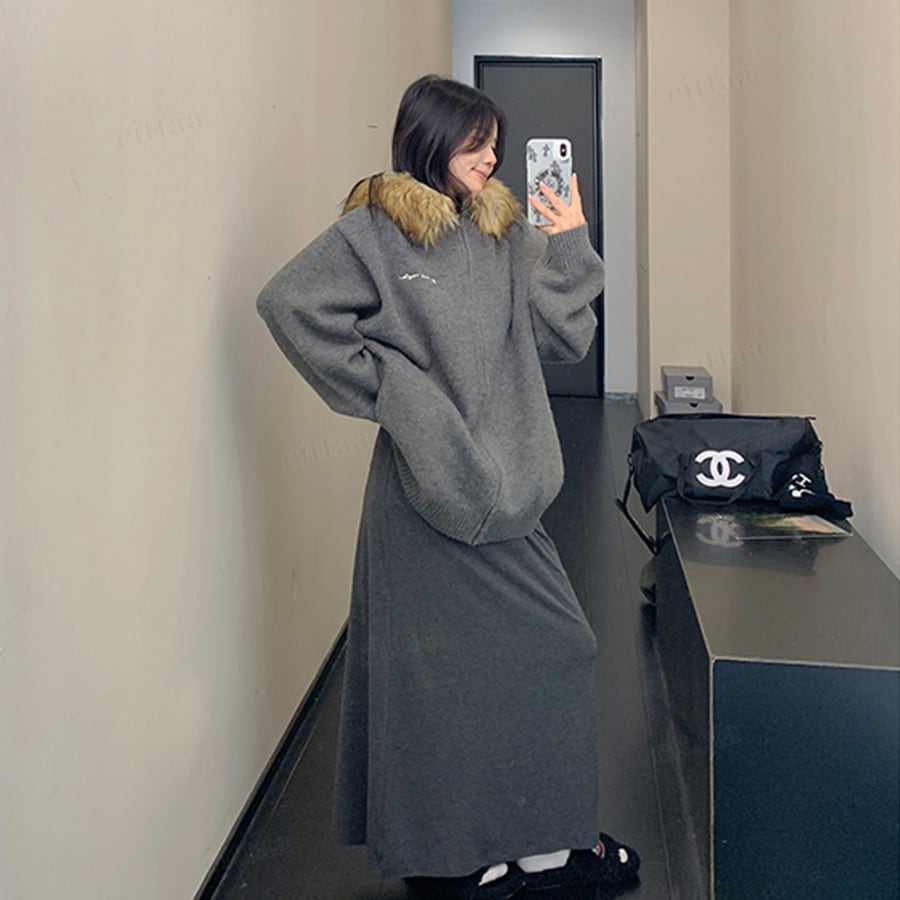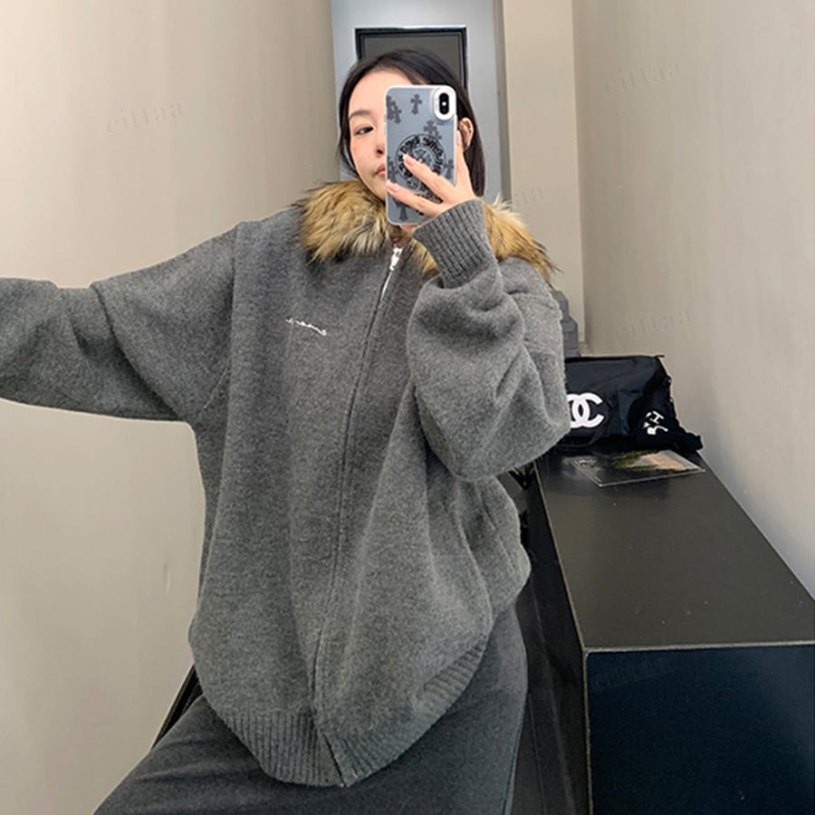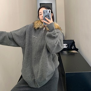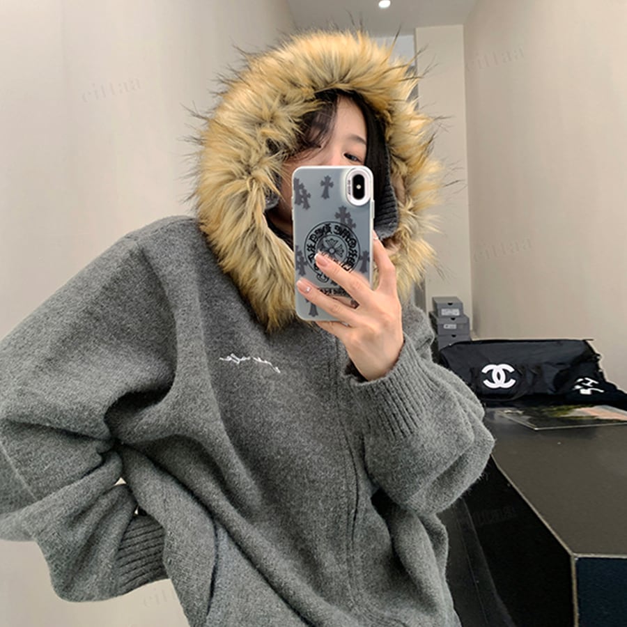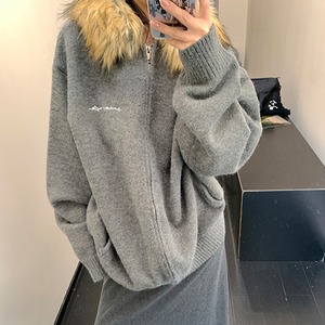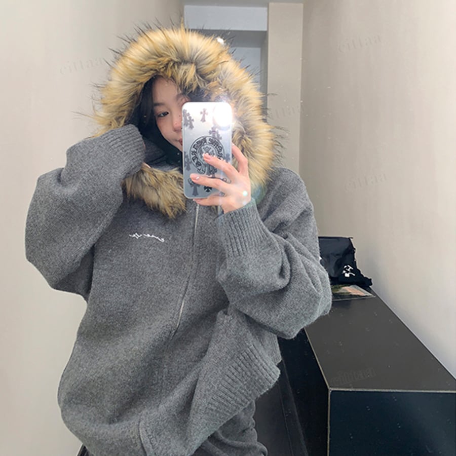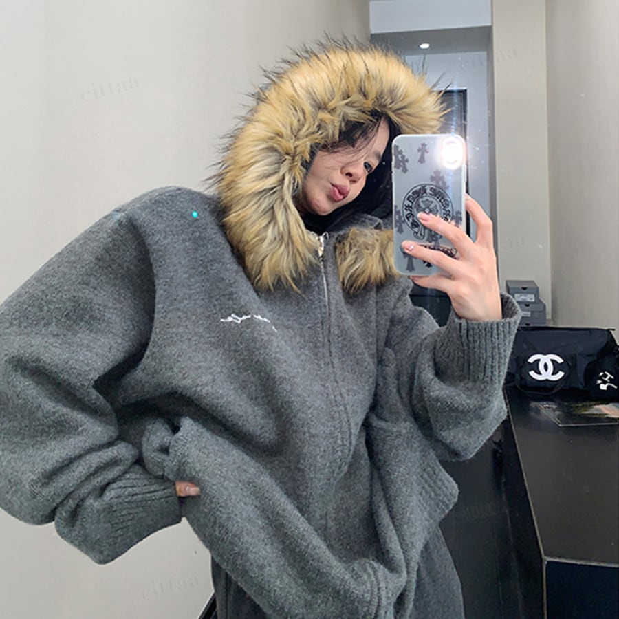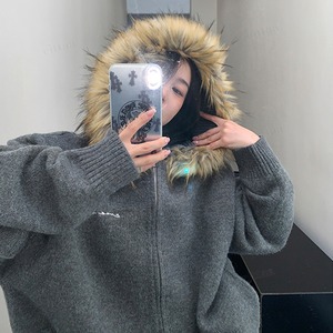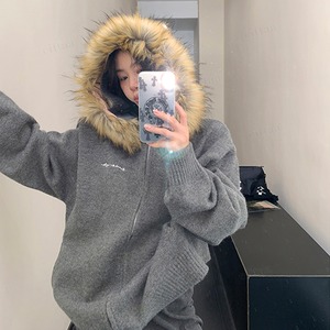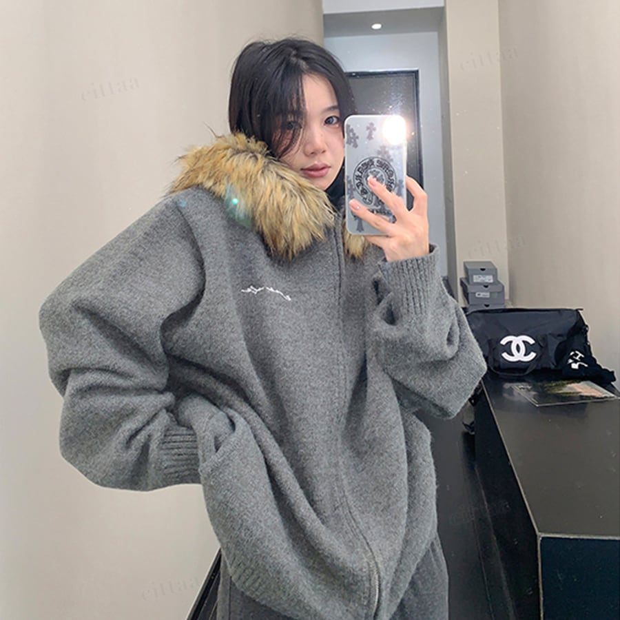 ★予約★D-678 2025秋新作♡ファー付きフードジップアップニットパーカー グレー
