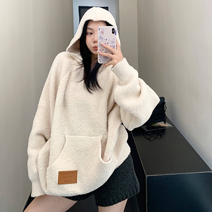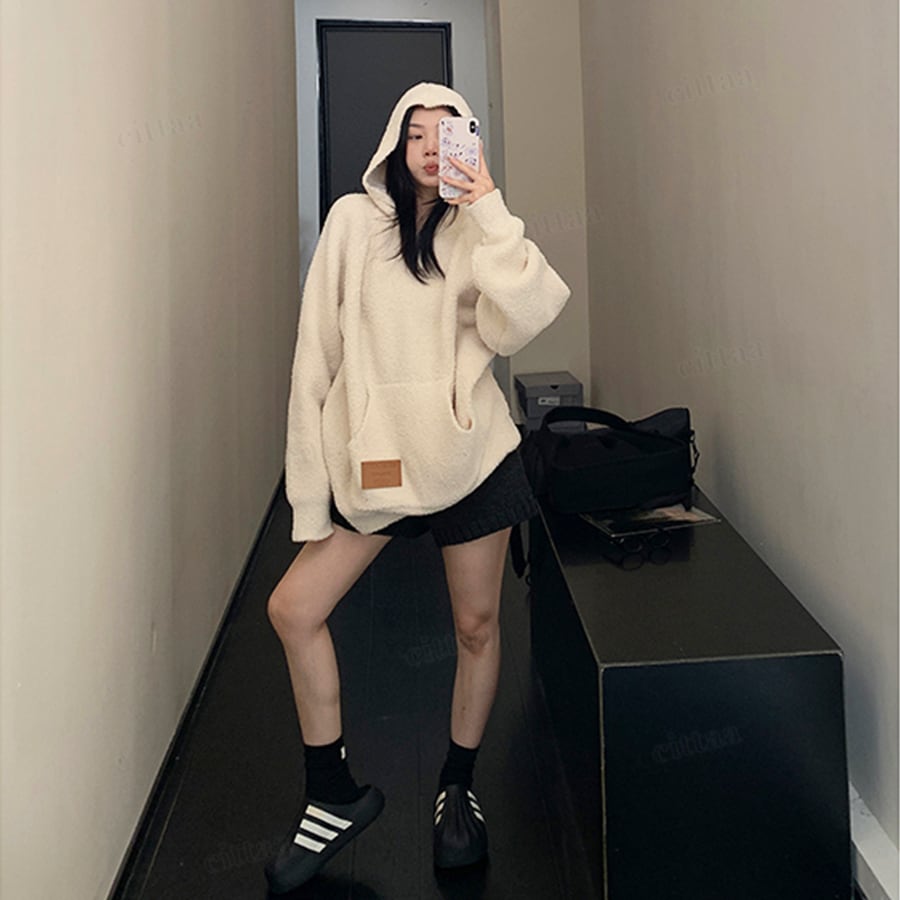 フェイクレザーラベルがアクセントに効いたもこもこボアフーディー♡