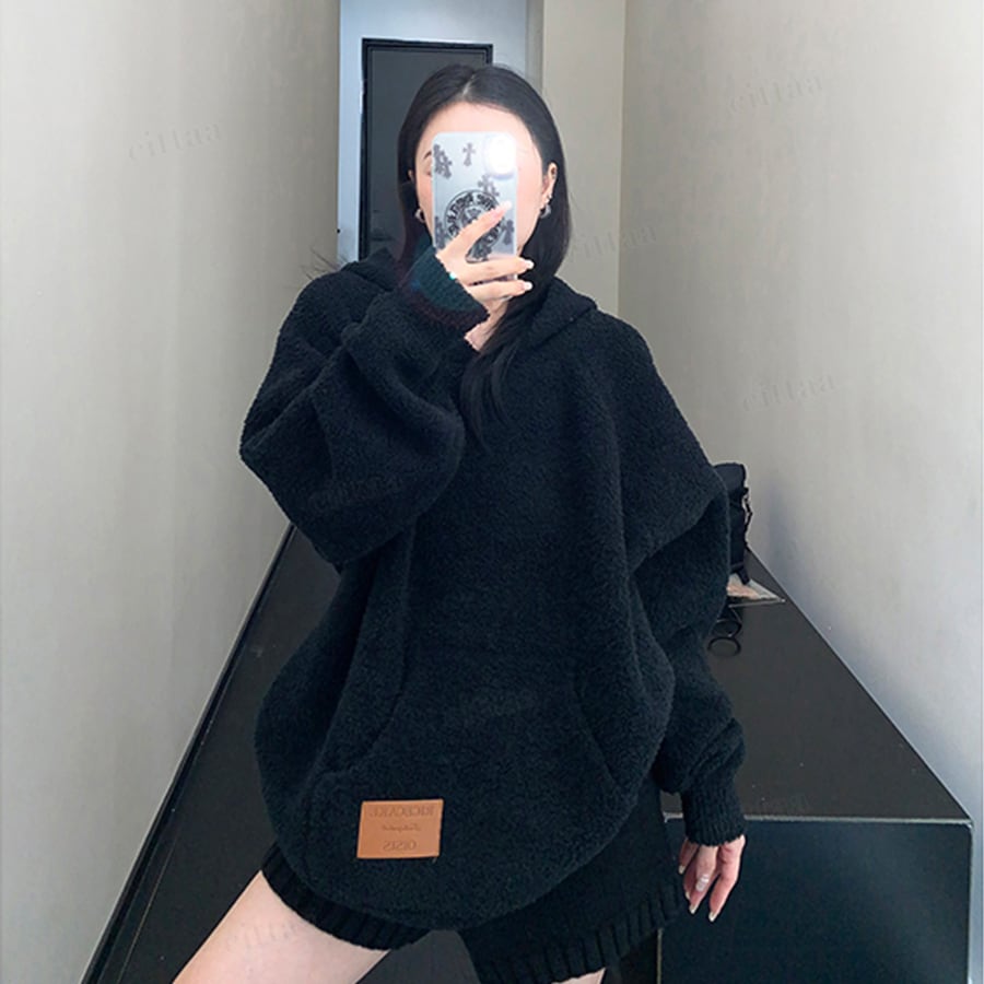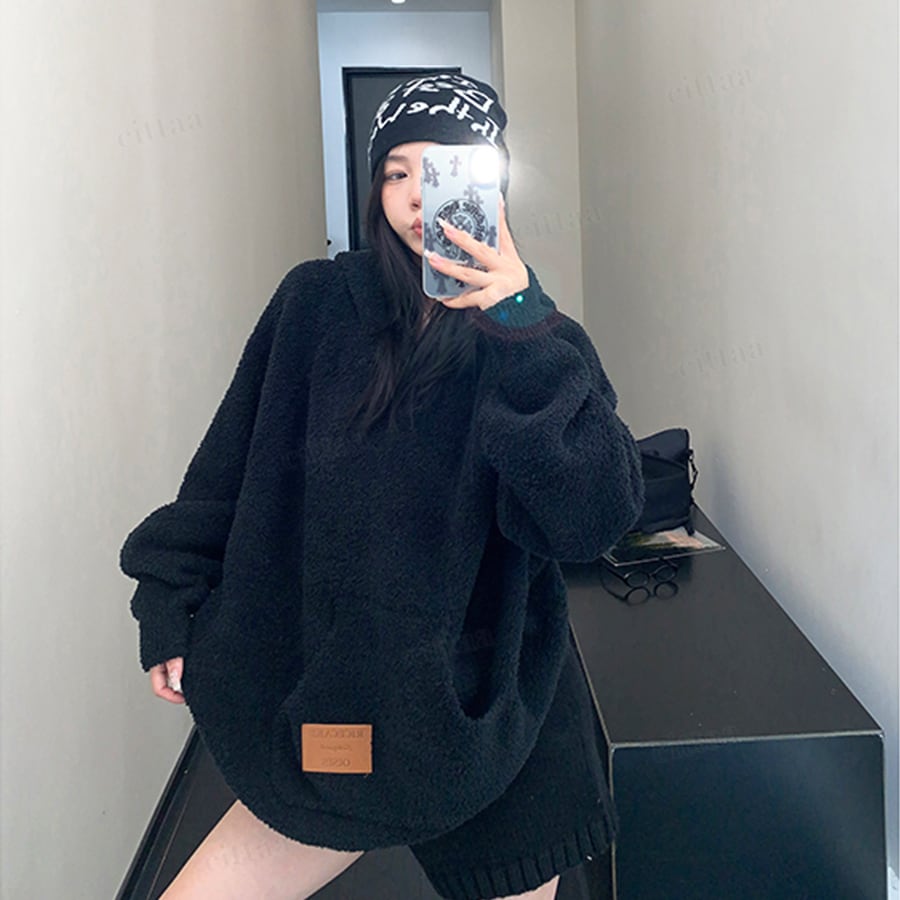 フェイクレザーラベルがアクセントに効いたもこもこボアフーディー♡
