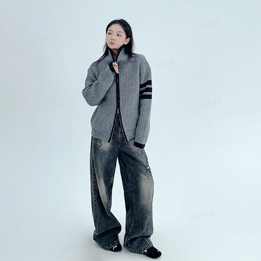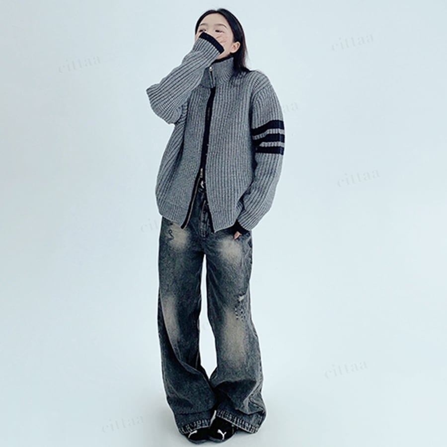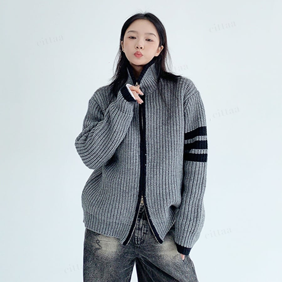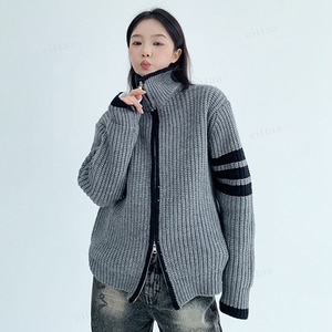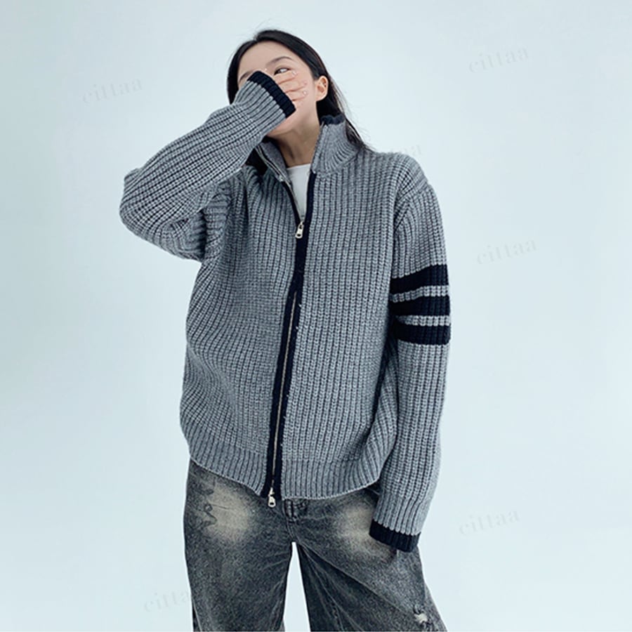 配色ラインで着映えるハイネックジップアップニットカーディガン♡