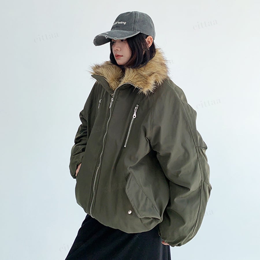 ボリュームのあるファーが顔まわりを華やかに演出。メンズライクなブルゾンシルエットで、甘すぎずトレンド感のあるスタイリングが楽しめる今季注目の1着です。