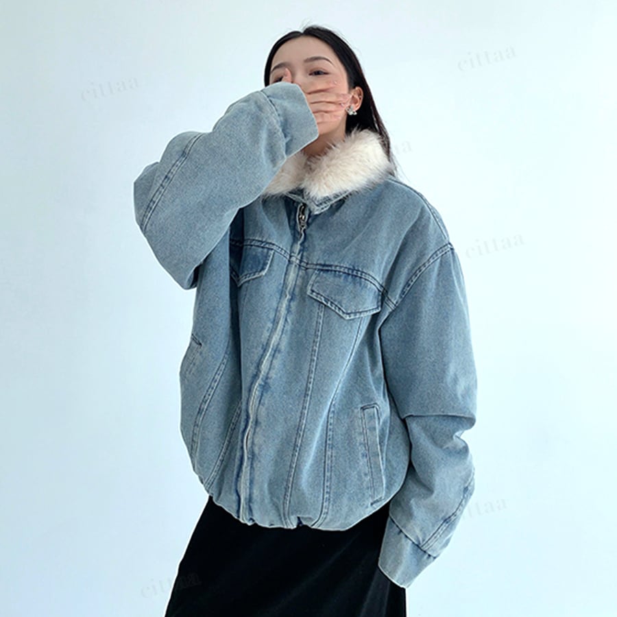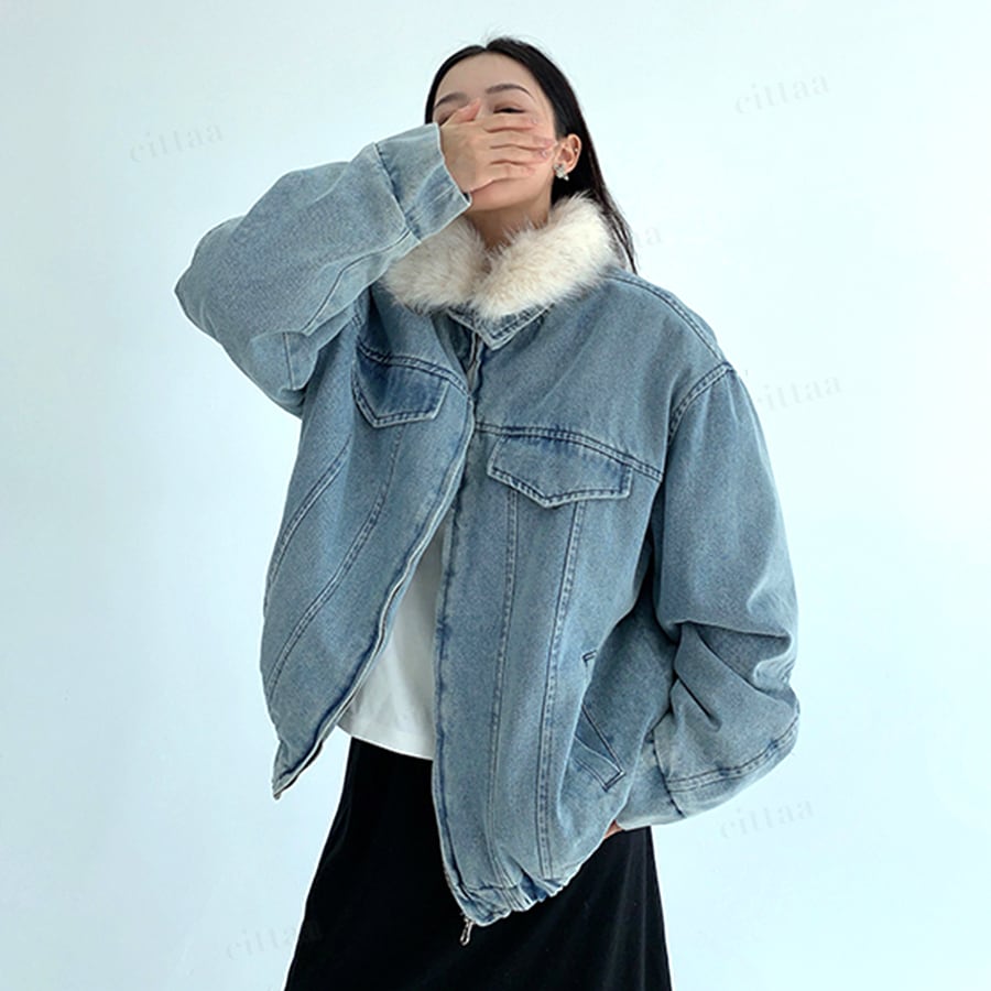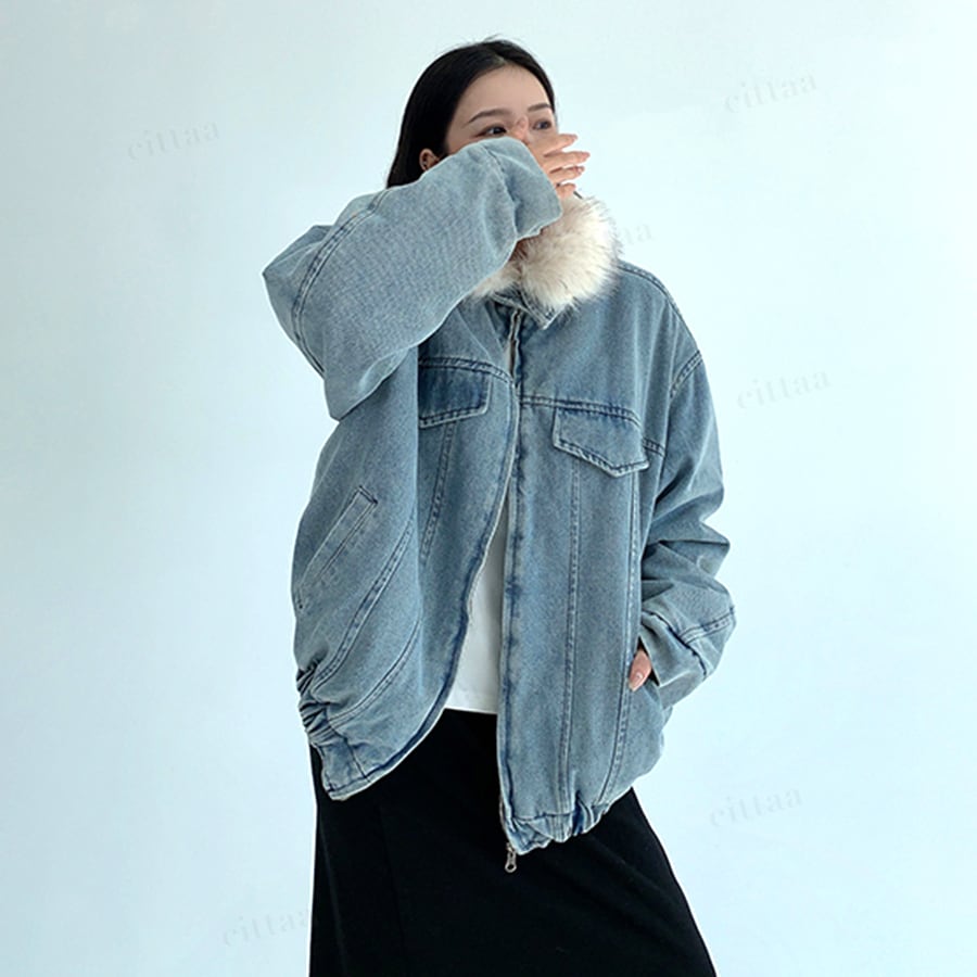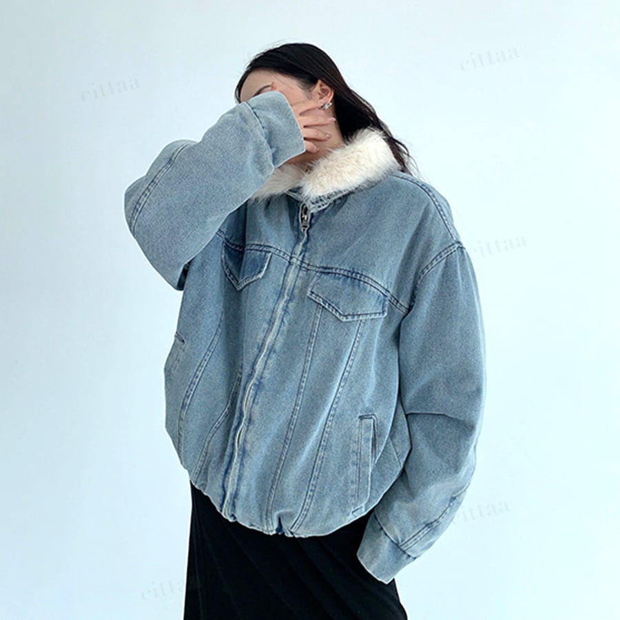 ★予約★D-699 2025秋新作♡ホワイトファー付きジップアップデニムブルゾン ブルー
