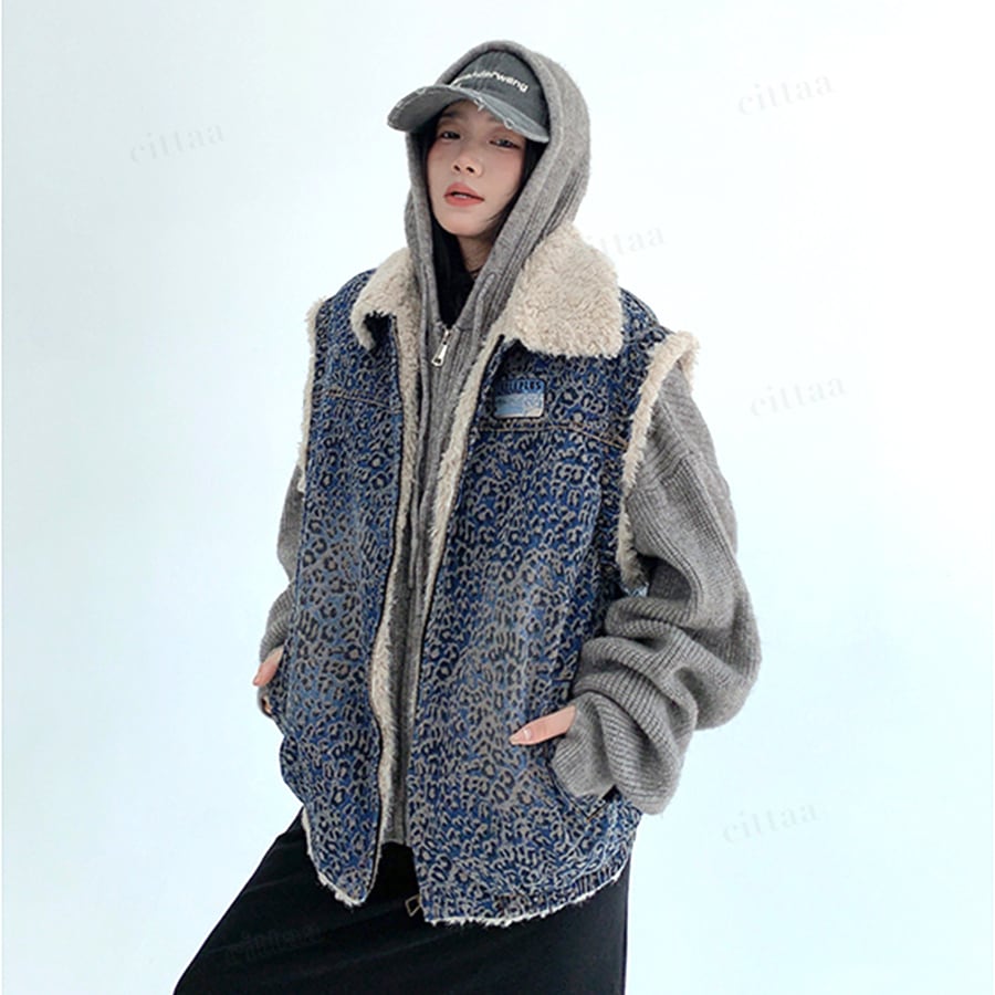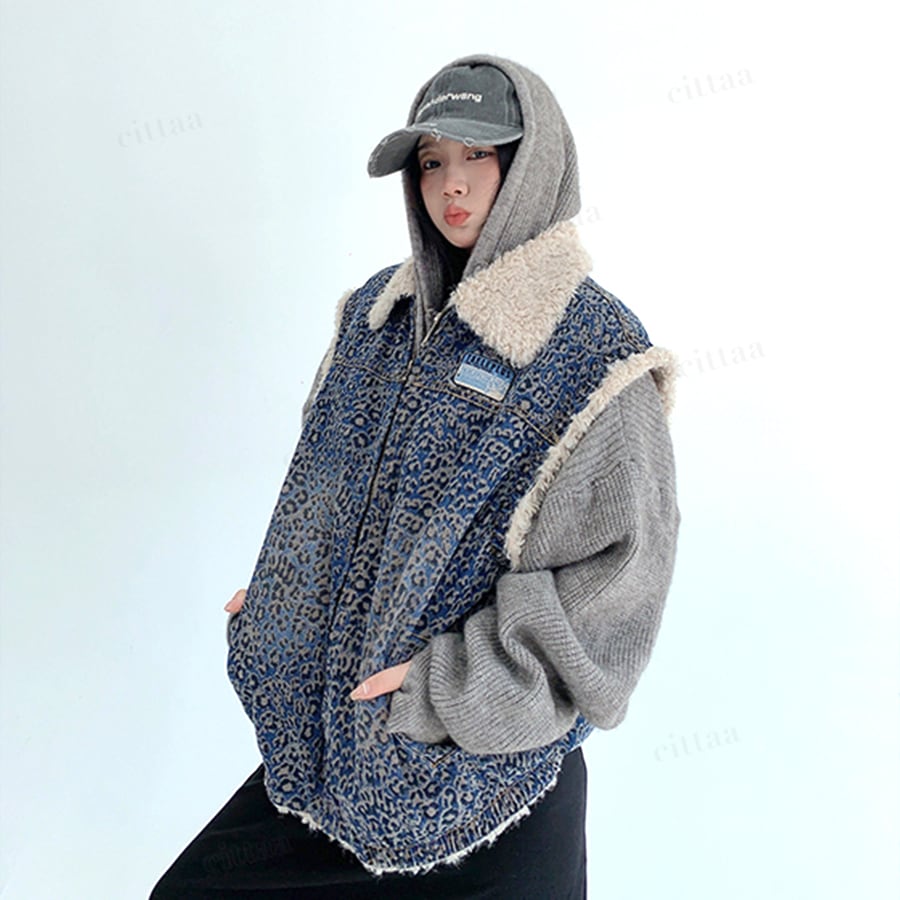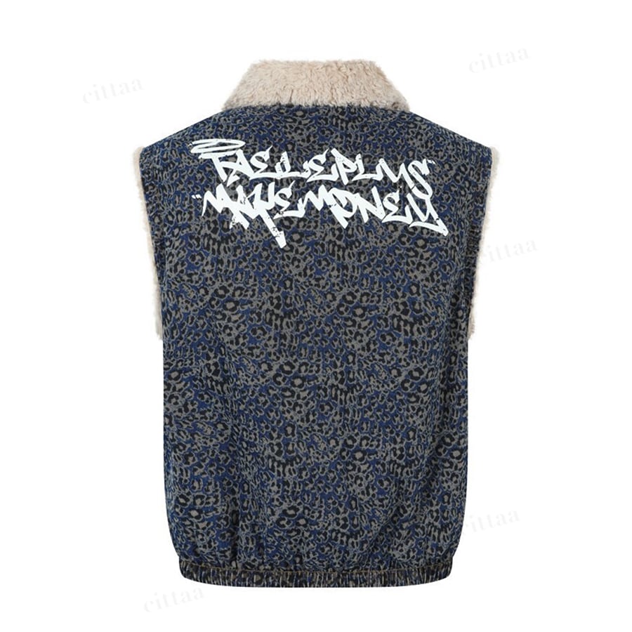 ★予約★D-702 2025秋新作♡TAELEPLUSバックロゴ裏地ボアレオパード柄デニムベスト ブルー