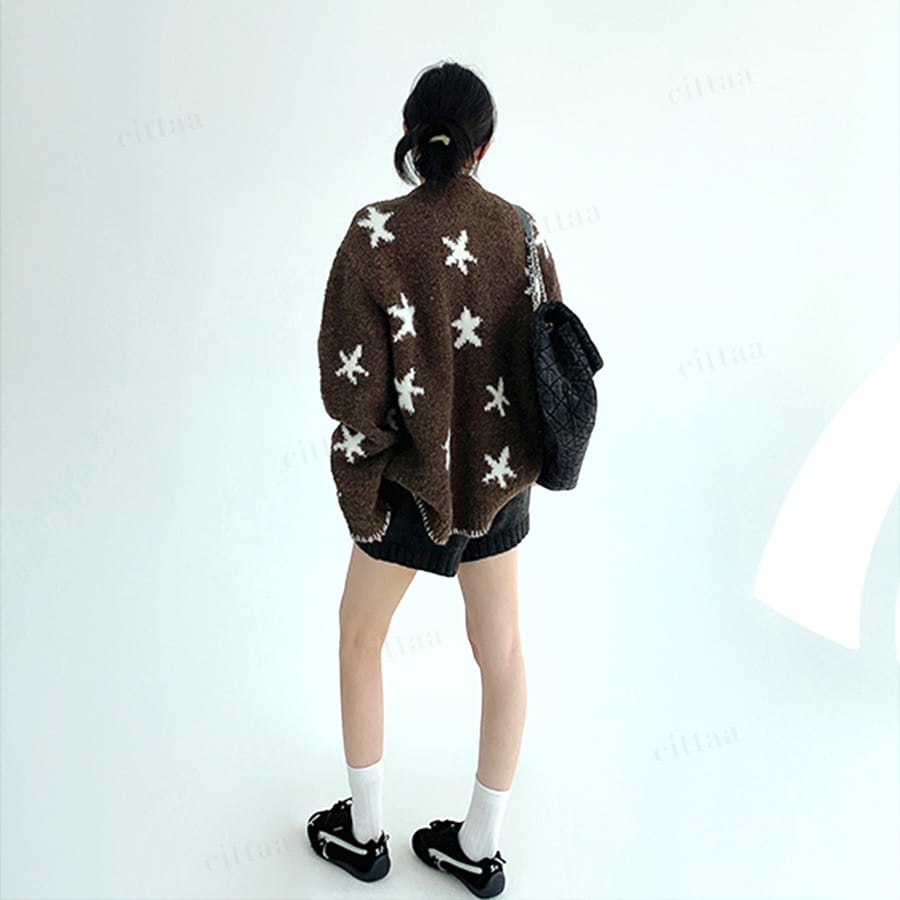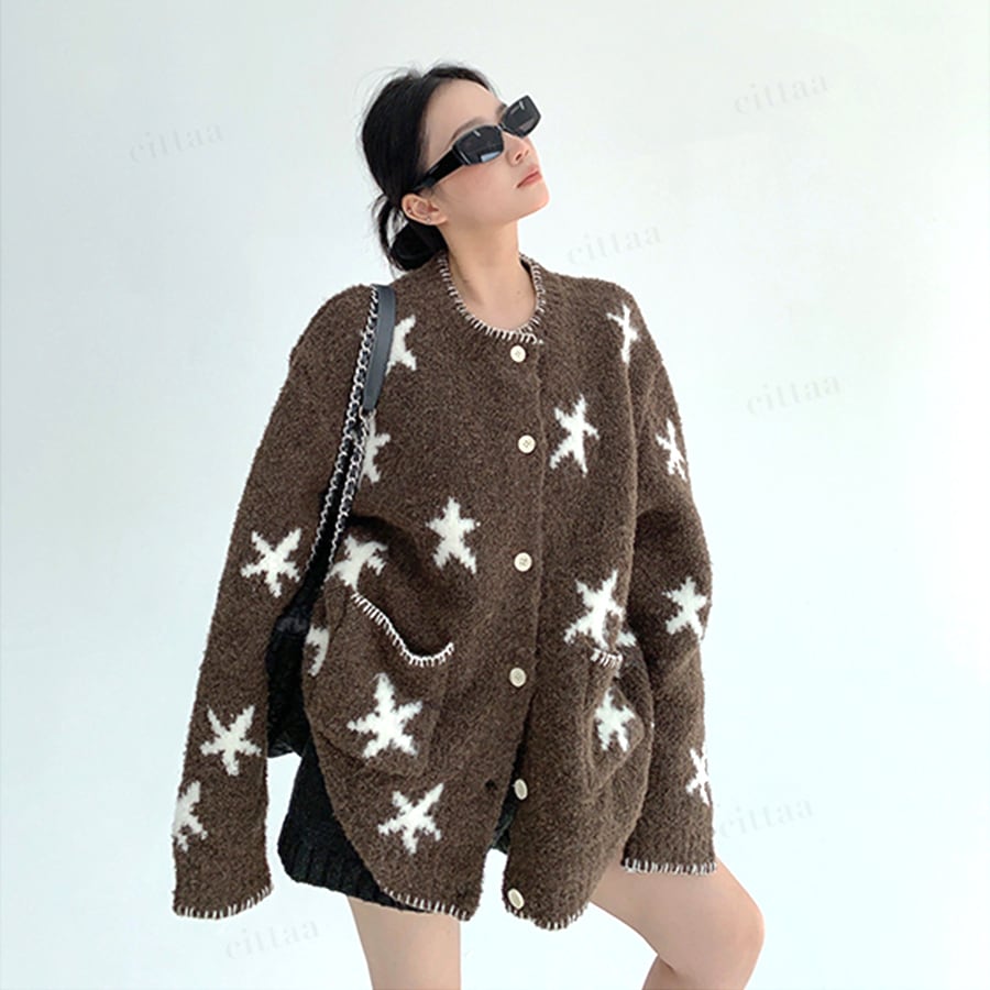 ★予約★D-700 2025秋新作♡星柄丸首ニットオーバーサイズカーディガン ブラウン