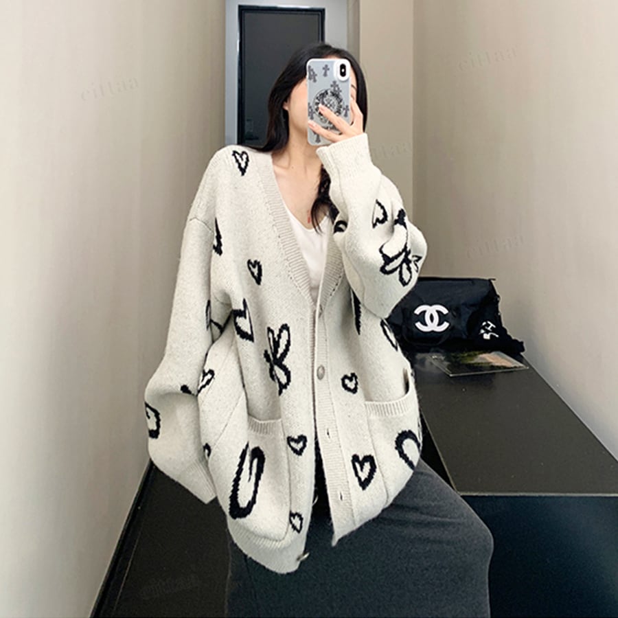 周りと差がつく!大人可愛いハート柄Vネックニットカーディガン♡
